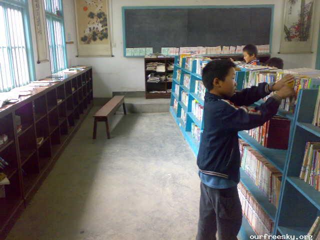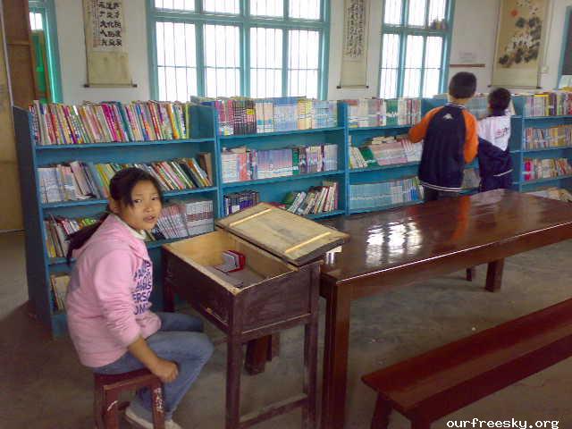 一般是学校后勤负责人麻昭星老师负责, 但由于麻老师日理万机, 所以开馆时间往往很难固定, 同时由于OFS所捐图书中有很多不适合村小的小学生阅读因而只能放在中心校的图书馆,所以为了能有效发挥图书馆功用,也为了能较便利地存放我们捐赠的图书,本学期是由中心校的志愿者分别轮流在中午午休和晚饭后去开放图书馆,并做好借还的统计工作的。