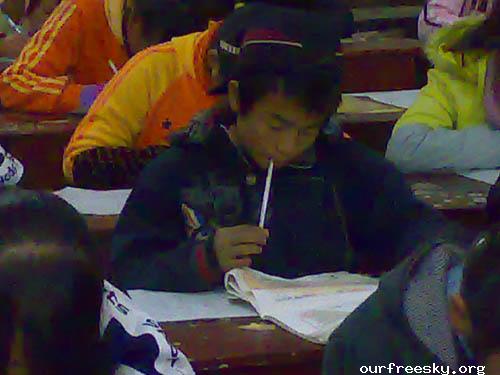 照片2:八年级学生英语考试(这孩子在看地理书)