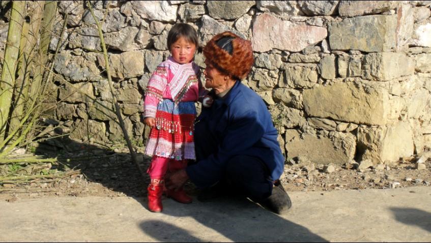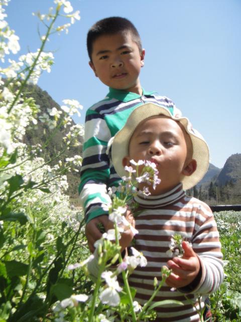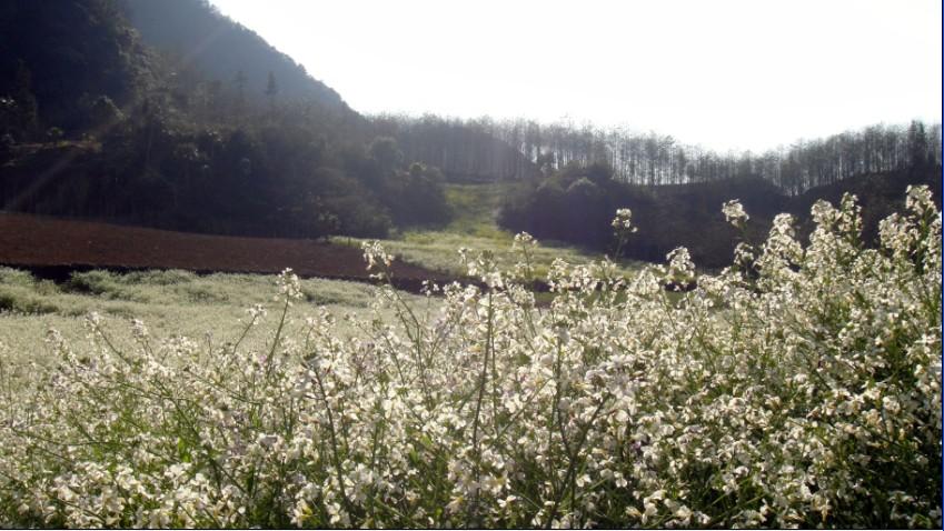 太阳落山前,我们一行在杨副的悦动的跃动中达到那个叫做“新房子”山村,下车前就被眼前蔓延数十米的萝卜花和油菜花带里沉醉了,远处青山如黛,山脚下黄白紫彩带铺陈开来,美不胜收。杨副带着我们在赴宴的这个村子里兜了一圈,我们在捕捉新奇的同时被村里人一样当新奇捕捉。认识了几种我们闻所未闻的植物,有的可食用有的可使用有的却是碰不得……晚宴就是那种在家门口摆N多张桌子招待来客的家宴,气氛挺好,夕阳西下,其乐融融,小寿星也很喜庆。不得不再次提一下本地饮食习惯:荤菜、纯素菜大多都是直接清水炖,盐味也很淡,他们都是直接蘸一个单独用辣椒、味精、盐等佐料拌好的料碗吃;难得有小炒,那油也是厚厚的一层。