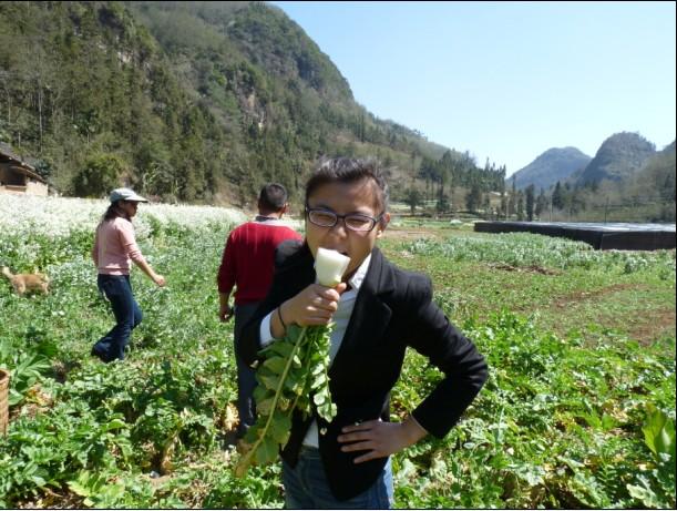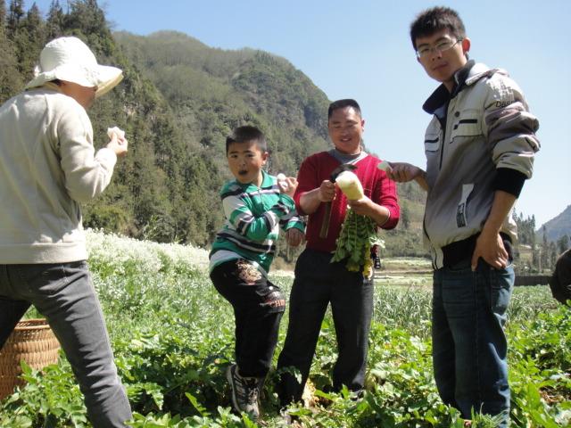杨副的老家大松树村环境真不错,据说是白云乡辖区内气候条件和地理环境均最有优势的一个行政村。果然如此,山有多高水有多深。做饭前,我们仨志愿者和背着竹篓的杨副一起下地去拔白萝卜,嘻嘻,那白萝卜真水灵真好吃,那雪白的萝卜花海真美,我还站在花海里留了影,我自称是花仙子,徐老师不给面子说萝卜花仙子,石老师也不给力说是苦菜花仙子……午饭在杨副父母家一起动手做了豌豆苗饵块,汤足饭饱后,杨副又带着我们仨本村一圈游,见了传说中的两棵龙树(本地树名叫砂糖果树,不知道是啥树)——据说很灵的两棵守护树,见了一位退休十二年的吕老师,见了很都不认识的植物(臭牡丹之类)。我还喝了天然矿泉水,杨副教用树叶做的水杯,嘎嘎,伸脖子喝时那丑态被杨副拍到了。绕完一圈时,我意犹未尽,想要爬山,徐老师有些累不想去,说把剩下的三分之一村子转完就算了。结果吧,我们绕啊绕又绕上了山,哈哈哈……山上空气真好,这几天吃药加喝酒折腾得肺都快咳出来的咳嗽居然一下午都没出现,真是氧吧疗效好啊!游村过程中,我的一个梦想被现实改变了,原本是“买屋十亩,绕田而居”;此刻变成了“买屋一亩,绕田而居,依山而建,傍水而行”,多么惬意啊,夕阳西下,我在山野小楼前备饭备酒……石老师不给力,总是在我高喊出这个梦想时,就插一句:还得有个牛郎给你挑水……