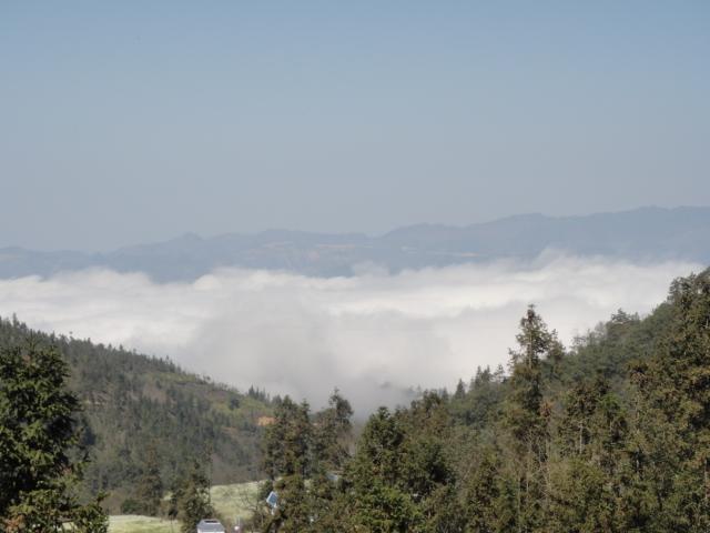 来白云乡的路途如何,让我不得不感慨一句:误入白云深处,盘桓盘桓,穿越浓雾仙山。我们大多时候都在能见度不超过五米的浓雾山路上前进,根本不知道前面何时该转弯何时会有车辆、行人迎面而来……好不容易能够正常看到路况了,司机乡陈副书记说:“这还算好的,大多时候尤其是阴雨天,是始终都看不到路况的,幸亏路修得好;我们开车主要都是靠对这条路的熟悉,等会我们要穿越一个雾区,那简直就是上天了,还能够看到云海的。”在我们正在感慨路边及山上遍布的香蕉树上成串的香蕉,正在对未来能够吃不完的水果垂涎时,我们就像神仙一样进了白云的深处。我兴奋地说:“我是仙女,我是仙女,我从天上来!”南溪河桥头,乡领导体贴地停车让我们下车拍照、欣赏。然后又向上行了几分钟,我无意间看到西北方翻滚的云海,高兴地请领导停车,和徐老师兴冲冲地下车拍云海,眼看着山雾如瘴气一般、如有生命一般匀速爬上山林,我忽然冒了一句:武侠小说里的毒瘴么……