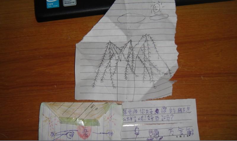 早上穿衣服时看到那可爱的手掌大小的信封,很温馨。站在厨房吃早饭时,有点按捺不住了,小心翼翼拆开,眼泪水又要下来了——一张小纸条“张老师,你好,你的脚怎么样了呢?好西了吗? 万金敏”,还画了三朵玫瑰花;一个折成三角形的作业纸,打开一看是一幅春天的铅笔画,柳树发芽,太阳普照,白云飘飘……说实话,这一个多月来,跟孩子们反复说不要送老师东西(收了一个孩子的东西,其他孩子就跟风收不住了),于是,孩子们选择画画给我们,我这里收到了至少六张画,徐老师、周老师也收到了。很温馨,寥寥数笔,心意很浓(为防止他们是撕作业本或者美术本给我们的,我多次在课堂和例会时强调不要撕书本)。