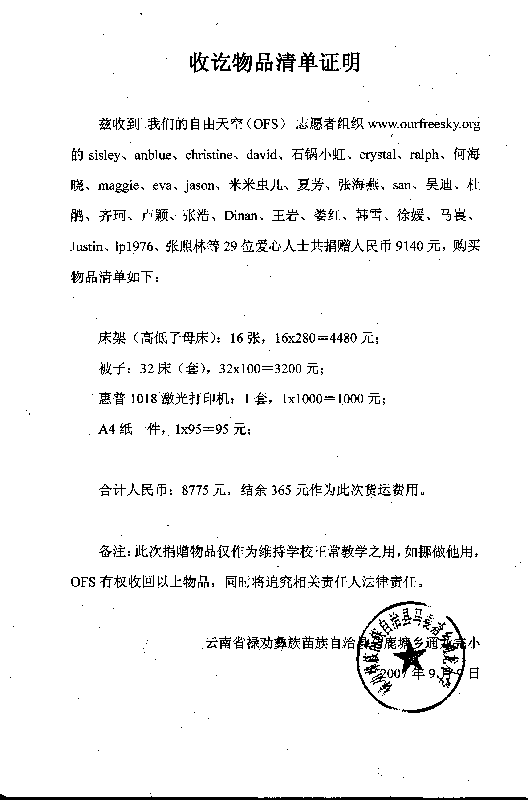 兹收到 我们的自由天空(OFS) 志愿者组织www.ourfreesky.org 的sisley、anblue、christine、david、石锅小虹、crystal、ralph、何海晓、maggie、eva、jason、米米虫儿、夏芳、张海燕、san、吴迪、杜鹃、齐珂、卢颖、张浩、Dinan、王岩、娄红、韩雪、徐媛、马嵔、Justin、lp1976、张照林等29位爱心人士共捐赠人民币9140元,购买物品清单如下: XFBk:~}sI