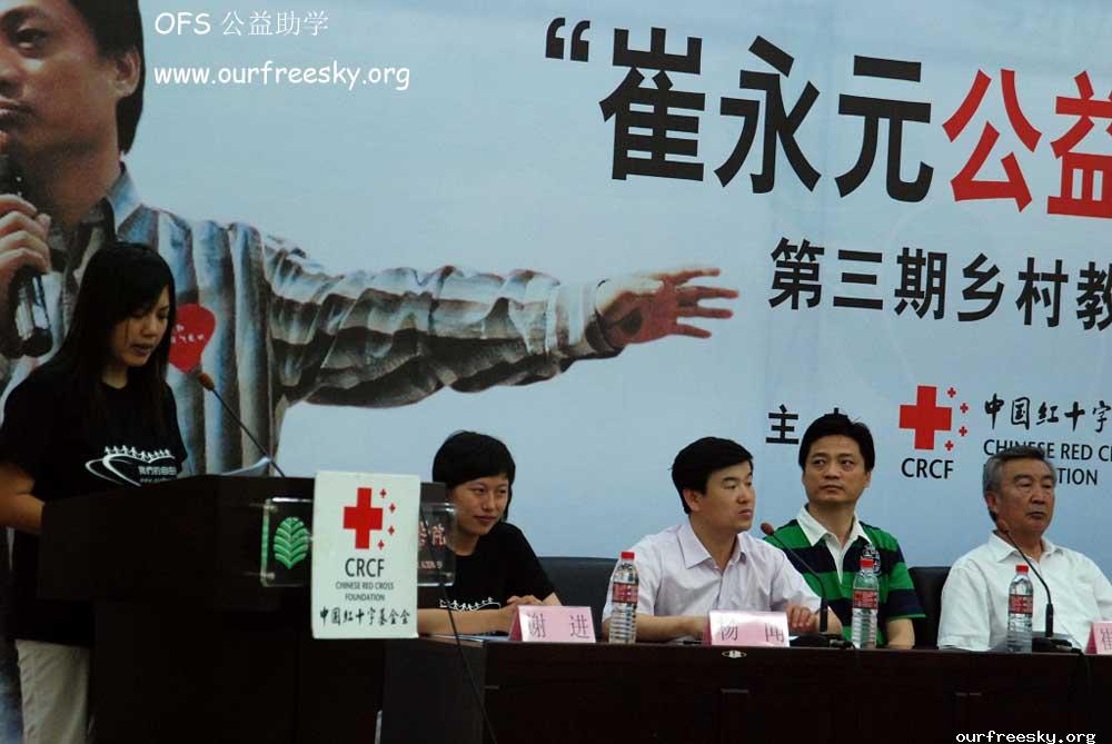 我是来自OFS组织的志愿者代表,谢谢崔永元公益基金给我们这个机会能够与来自中西部地区乡村的一线老师相聚在此。特别开心的是我今天在这里见到了来自湖南湘西州凤凰县麻冲乡的老师们,因为在08年8月份做为OFS的支教老师我和其他8位同事一起去了麻冲,进行了一学期的支教工作。当时我与另外两位同事就在麻冲乡中心学校教课,所以今天在北京又看到了相别半年的老师,心情特别激动,往事历历在目。