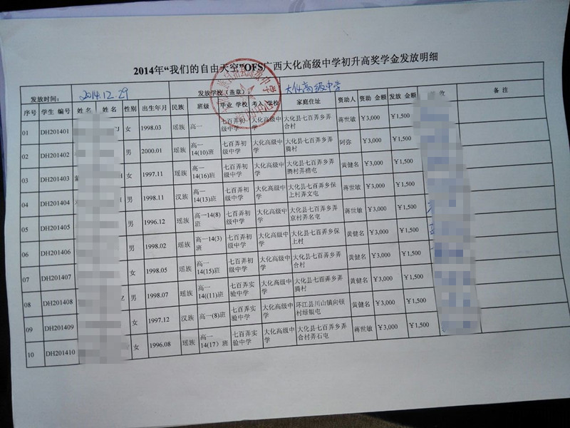 [走访报告]2014年12月大化高级中学奖学金发放公示 [复制链接]