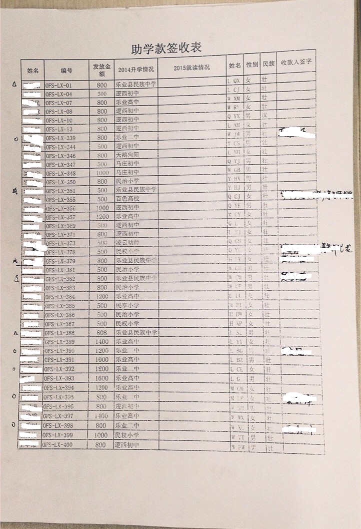 2015年春季广西乐业县逻西助学金签收资料公示