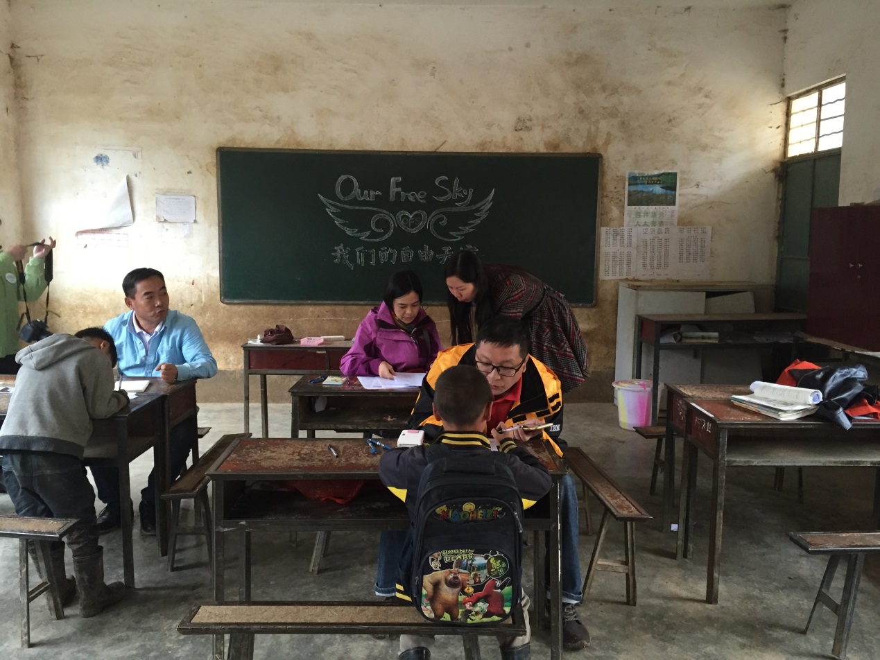 下午2点左右到达大村,到达时恰逢学校下课课间,我们一下车,入眼的是一排简易房,以为这就是学校。不长的时间很快围了一群学生过来,用渴望的眼神巴望着窗台里,走进一看原来是OFS捐赠的图书室,心里默默地给无数个赞!拐角看见学校,和我想象的差不多,是我小时候学校的样子,不过那是20几年前了,不在一个年代,所以不具备任何可比性,只能感叹,这仿佛就是我小时候的生活。看到学校横幅上写着浙江绍兴…的字眼,内心倍感温暖和自豪!急着吃完泡面填饱肚子之后匆匆忙忙地开始了学生谈话准备!当我踏进学校的瞬间,好几位小姑娘围着我用天真稚嫩的语气问我:“老师,你是新来这里的吗,你要在这里待多久啊?”就那一瞬间,我突然不知道该怎么回答,我应该如实告诉她我过两天就会离开吗?好像有一点不知名的愧疚感…看到学校教室里的场景,真的无法现象…生在长在农村的我,尤记得小时侯的梦想就是走出大山,但是和现在眼前的大山比起来,生长在浙江的大山真的太幸福!这里的现状远比27年前我出生时的大山还落后不知多少倍!
