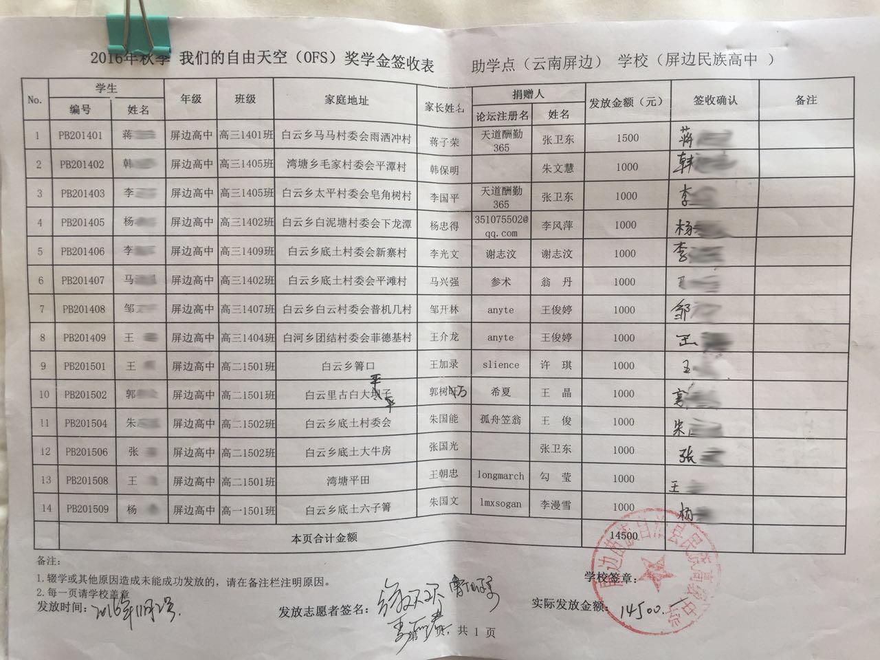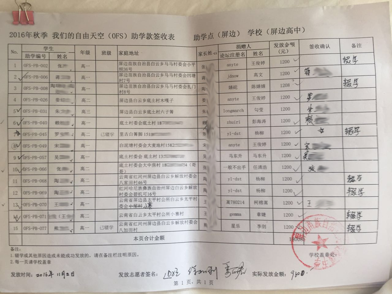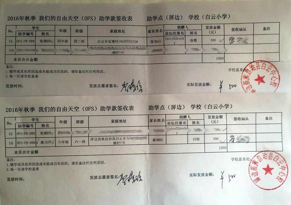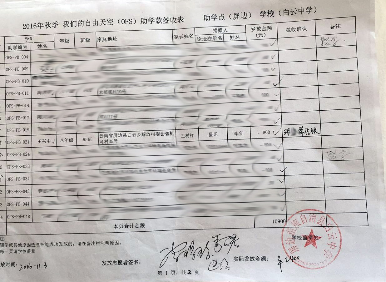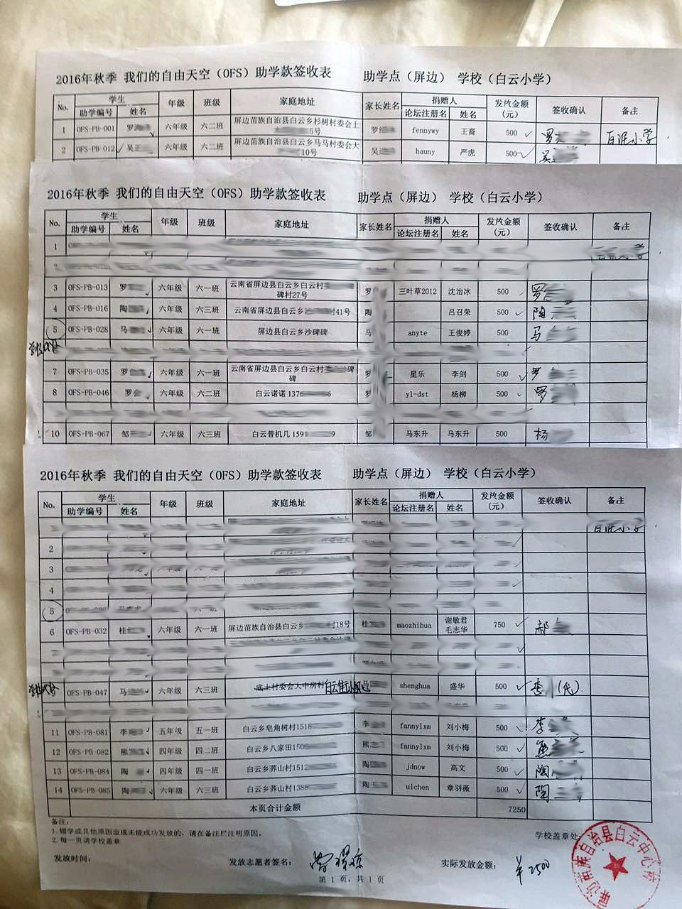 为保护学生家庭隐私,发布的签收表照片中学生姓名、家长姓名、家庭住址和电话都进行了模糊处理。因志愿者是根据学生家庭住址分成多组发放的,所以以下签收表会出现同一张表分成多张照片上传的情况,具体发放金额由已经签字的数量决定。