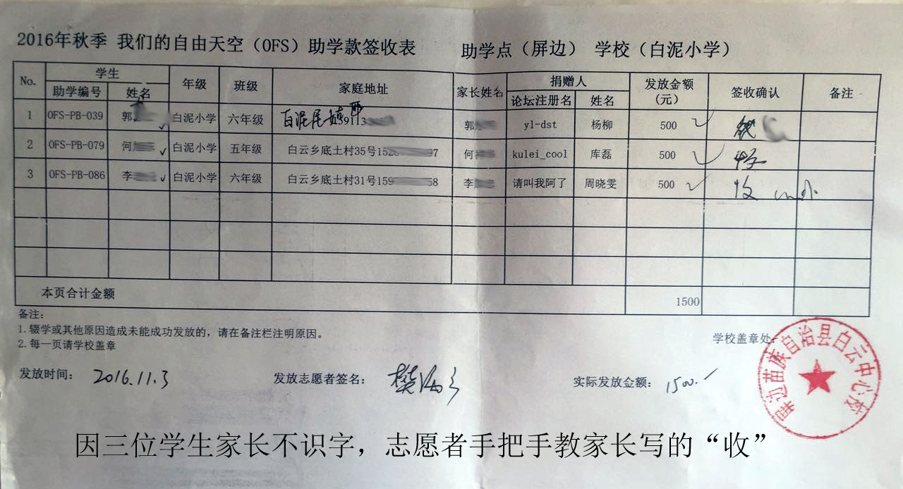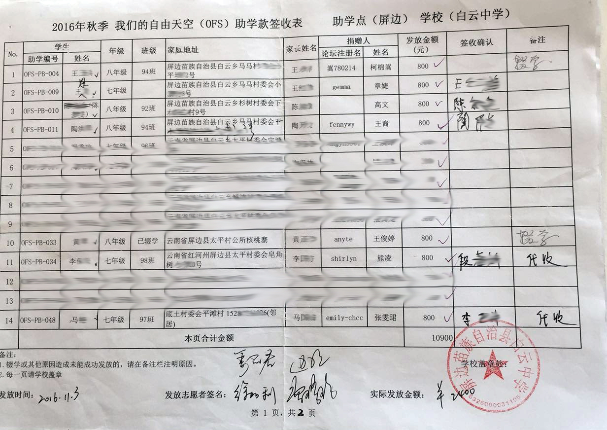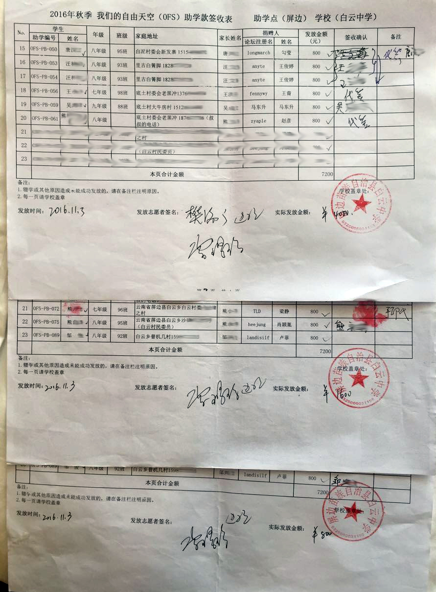 2016年11月2日-4日,7位志愿者深入云南省屏边县白云乡各个村点,分别对58名助学生进行了家庭走访,并为符合资助条件的贫困助学生和初升高奖学金生现场发放相应款项。具体签收表逐个发布,如有问题请及时联系。