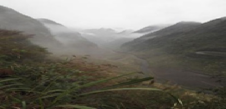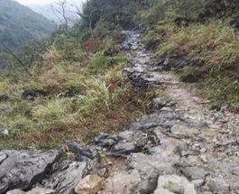 由于要走访的学生家庭太过分散,我们五个队员分成五路,分别由学校老师带领去往大山深处,由于我是唯一一个坐摩托车进山的,所以队长给我分配的任务是路线比较近的,要到访的家庭也只有二家。我全副武装地坐在蓝老师的二轮摩后座时,竟然还冒出了许些的豪迈之气。雨中的喀斯特地貌山体精美绝伦,沿着湾湾的山路前行不久,进入了崎岖的小路,二个轮子的车显出了它的调皮本性,它与路边的一块大石窜通一气,差一点就把二个大男人给扔下山谷,识相一点,我还是步行吧,蓝老师则推着车继续往前。