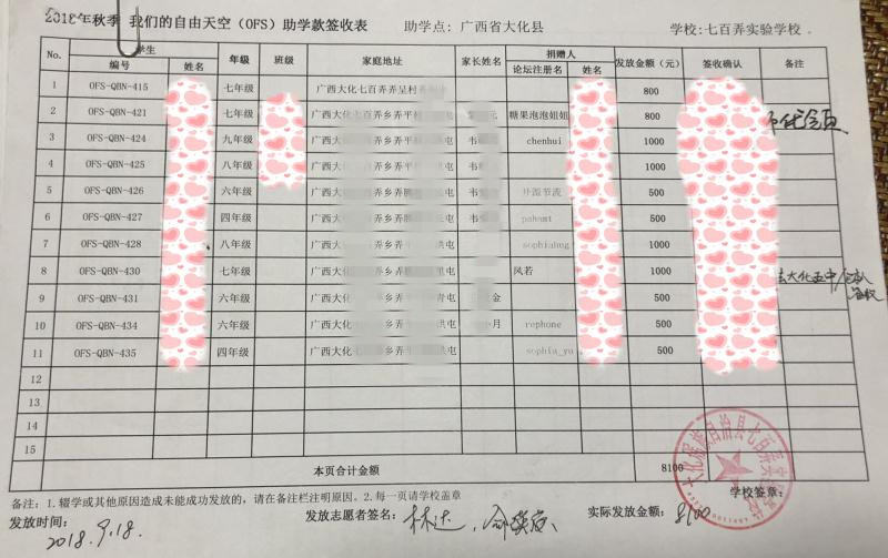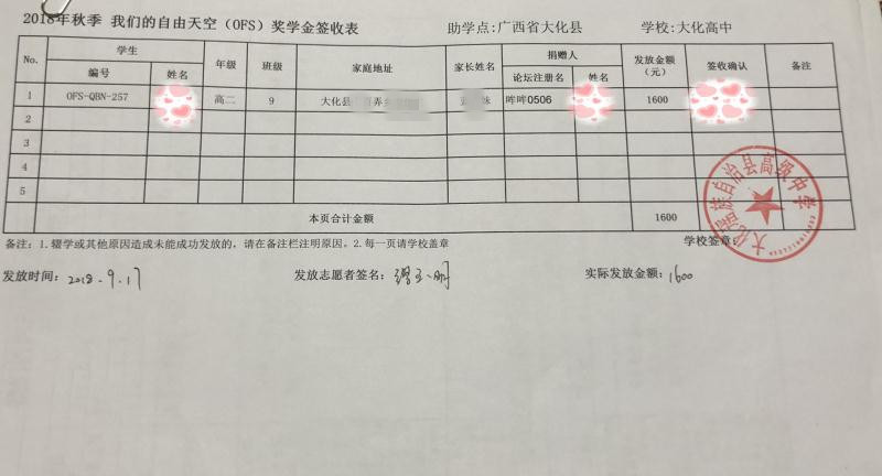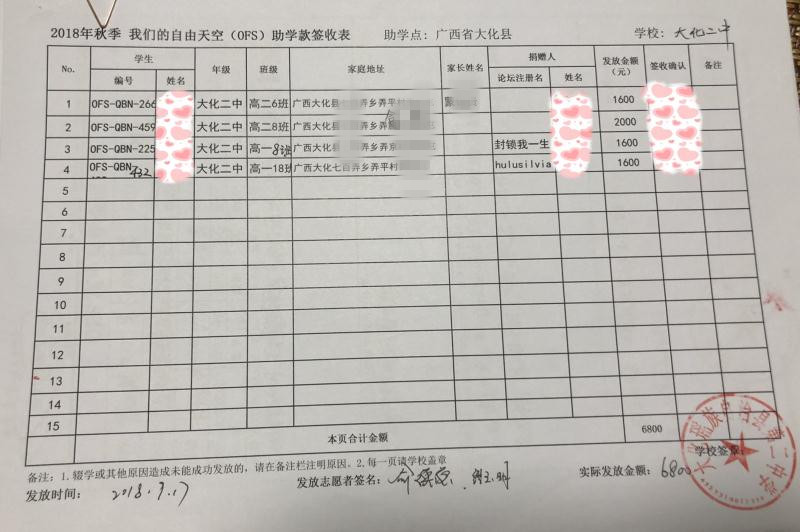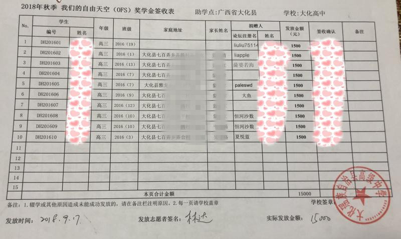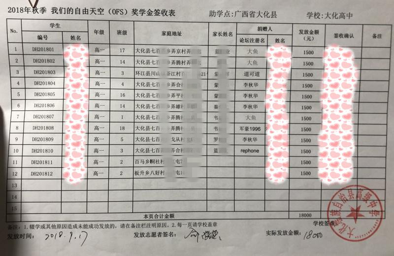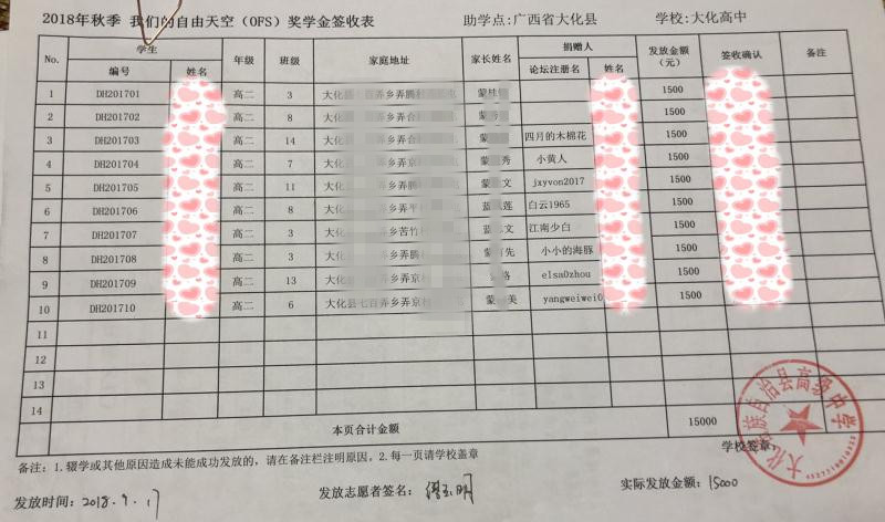 为保护学生隐私,签收表抹去学生姓名,学生资料已经发送到资助人邮箱,如有疑问,请咨询dahua@ourfreesky.org,或者kids@ourfreesky.org