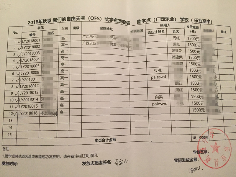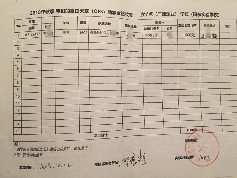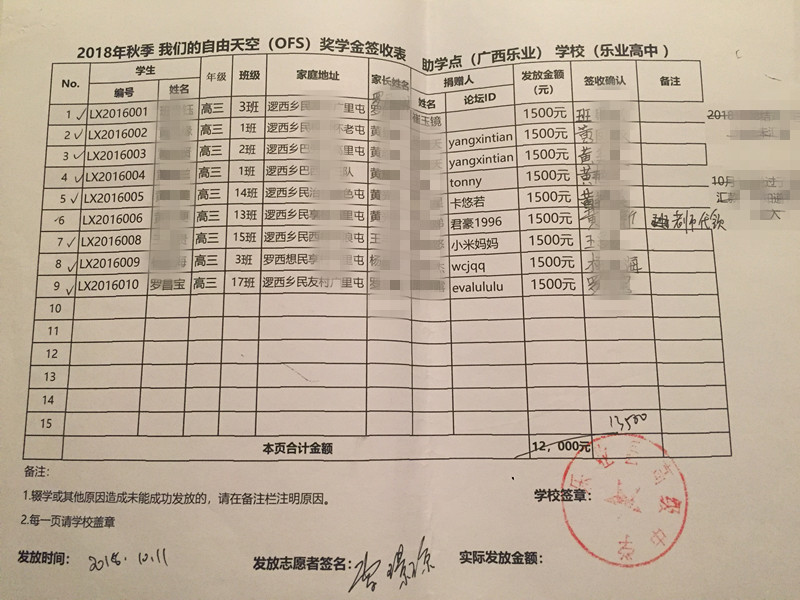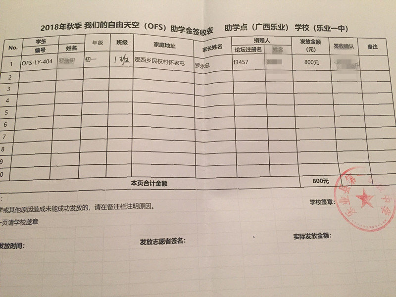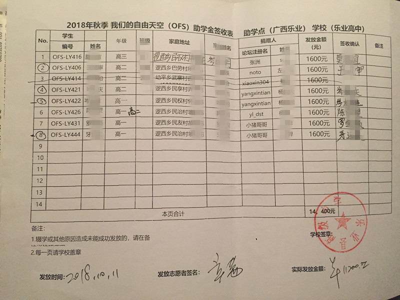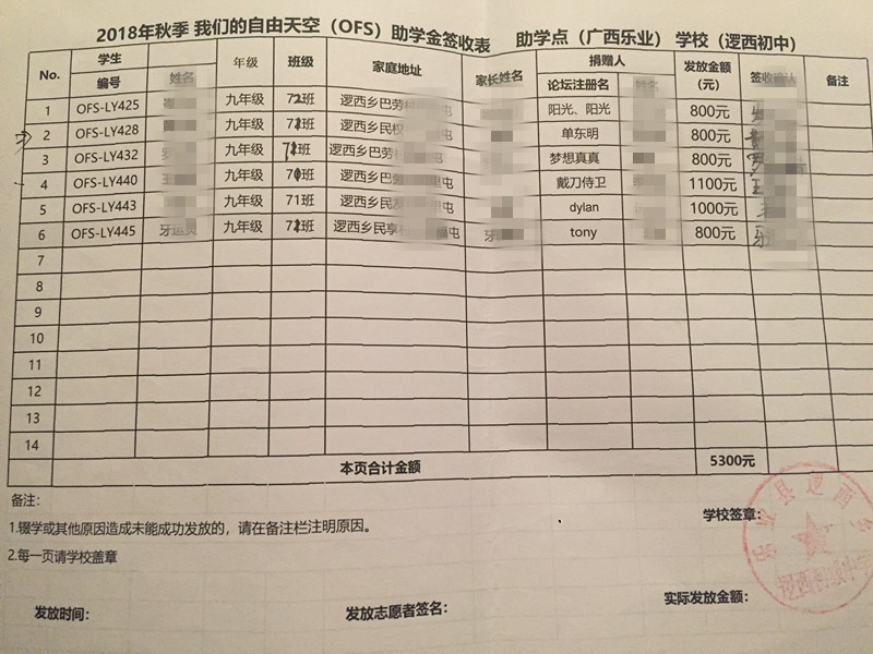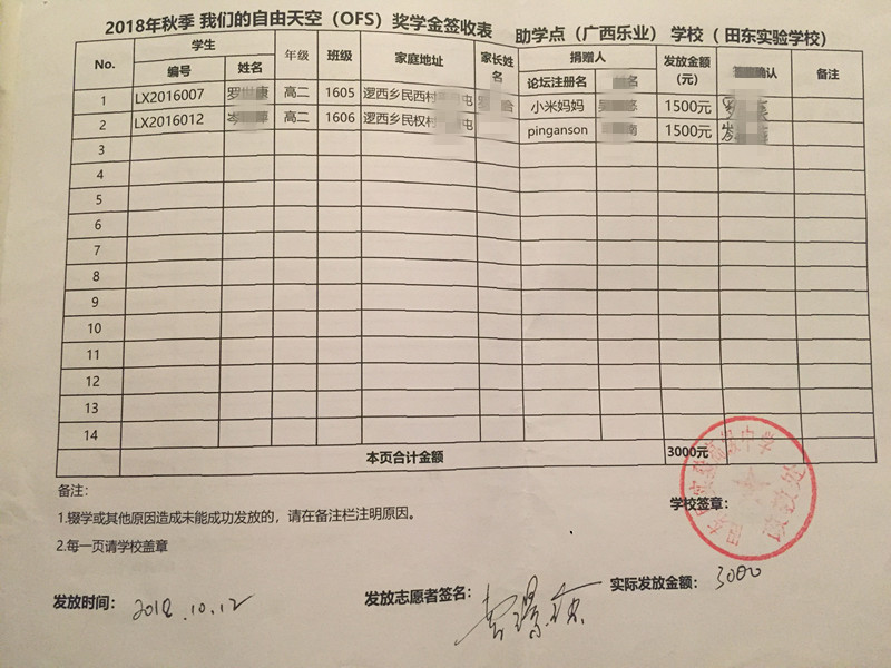 为保护学生隐私,签收表抹去学生姓名,学生资料将近期发送到资助人邮箱,如有疑问,请咨询leye@ourfreesky.org,或者kids@ourfreesky.org