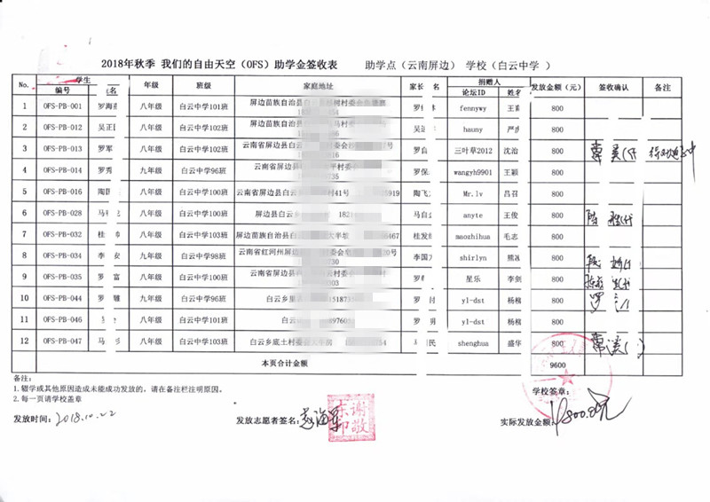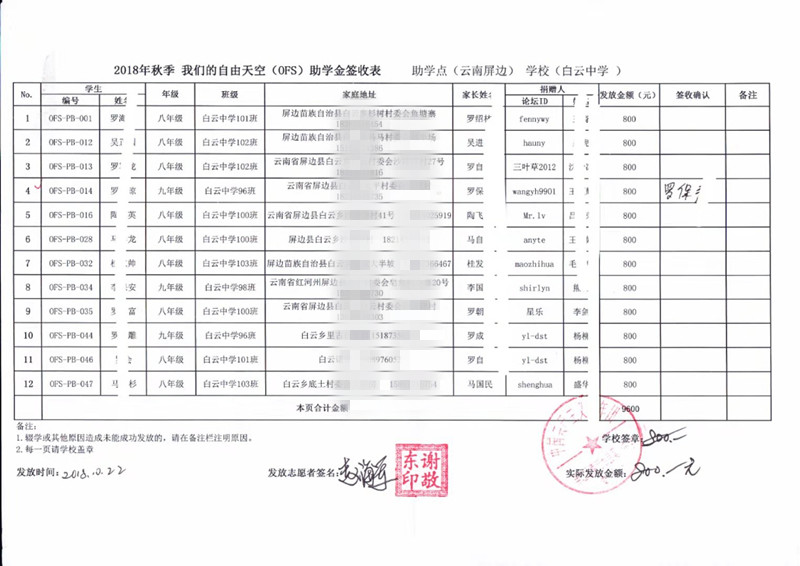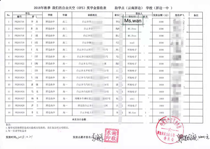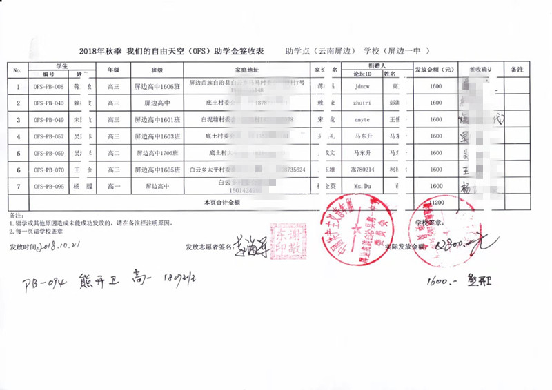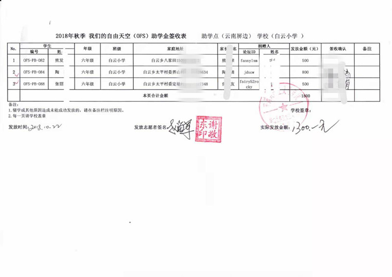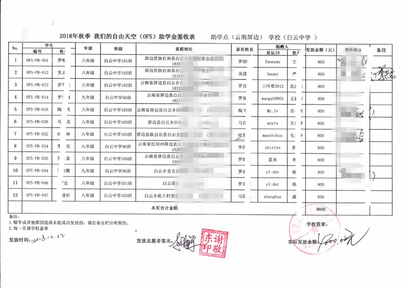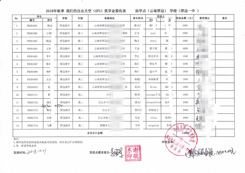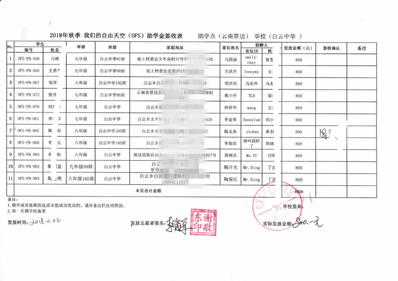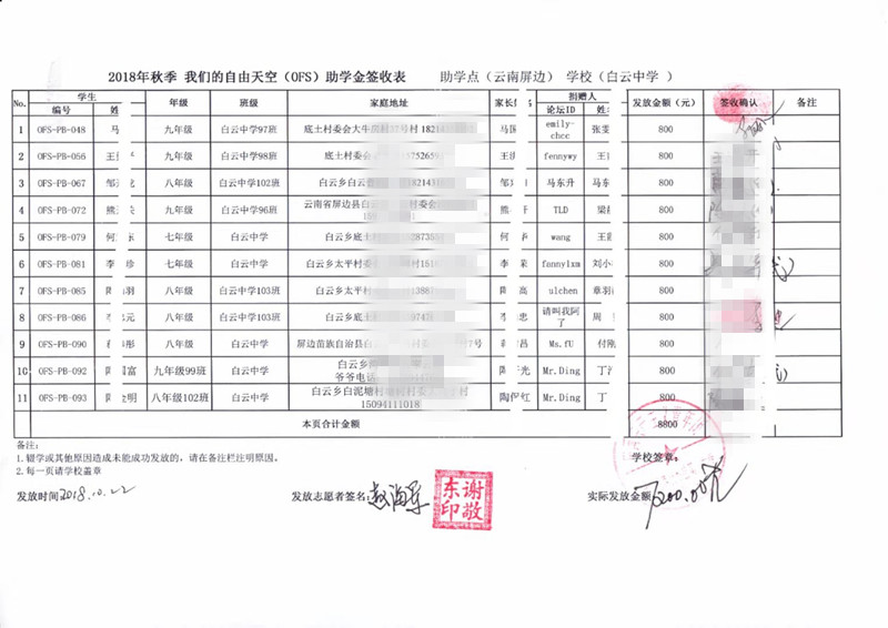 为保护学生隐私,签收表抹去学生姓名,学生资料待整理好后发送到资助人邮箱,如有疑问,请咨询pingbian@ourfreesky.org,或者kids@ourfreesky.org