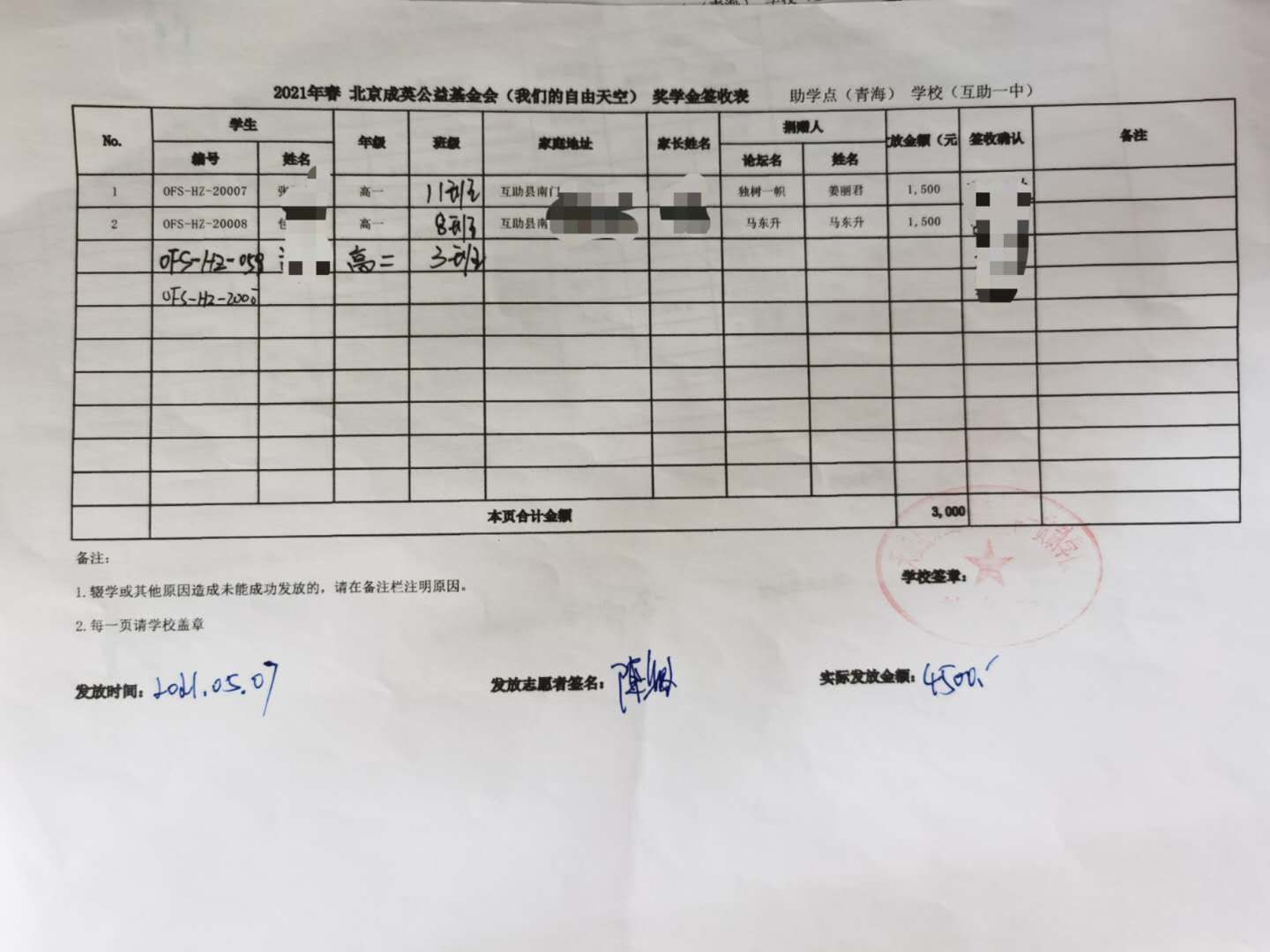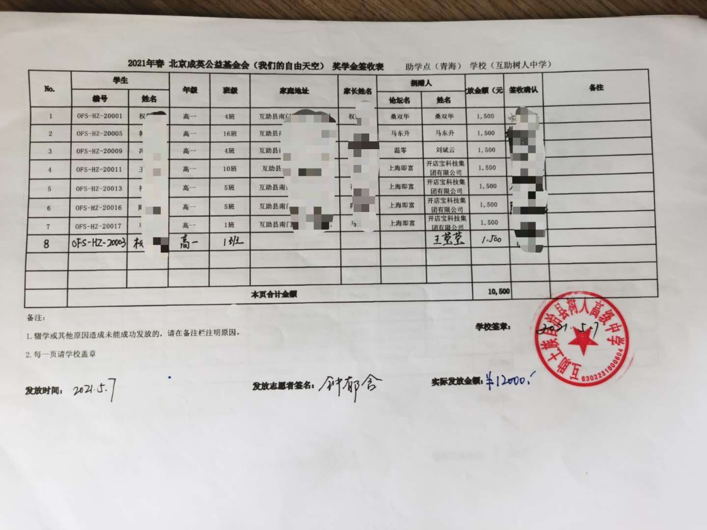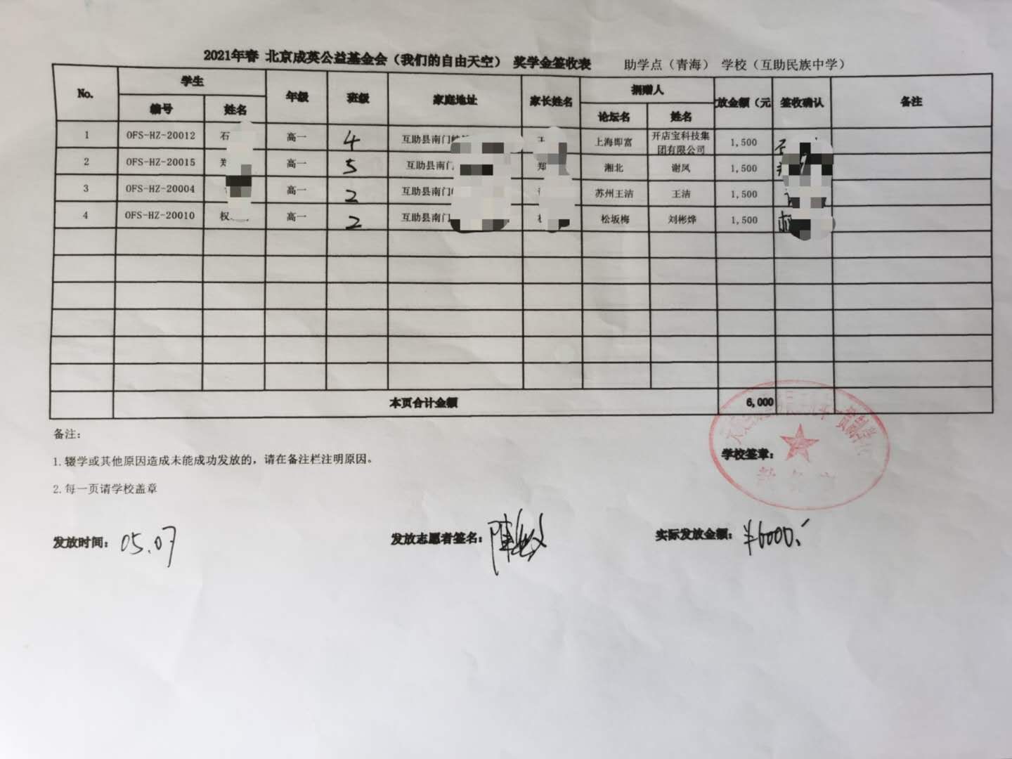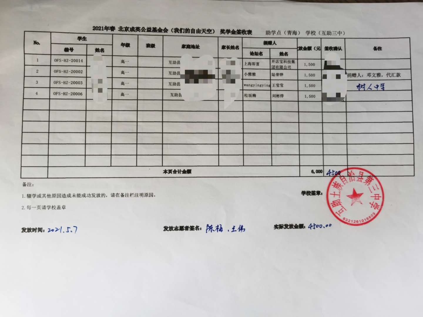 青海省互助县,天峻县2021年春季助学款发放于2021年5月6日-11日,发放完成.(本次由于疫情原因,青海湟源的点暂时取消,以后需要和老师们再进行沟通等事项,目前青海的奖学金项目建立到了互助县。)