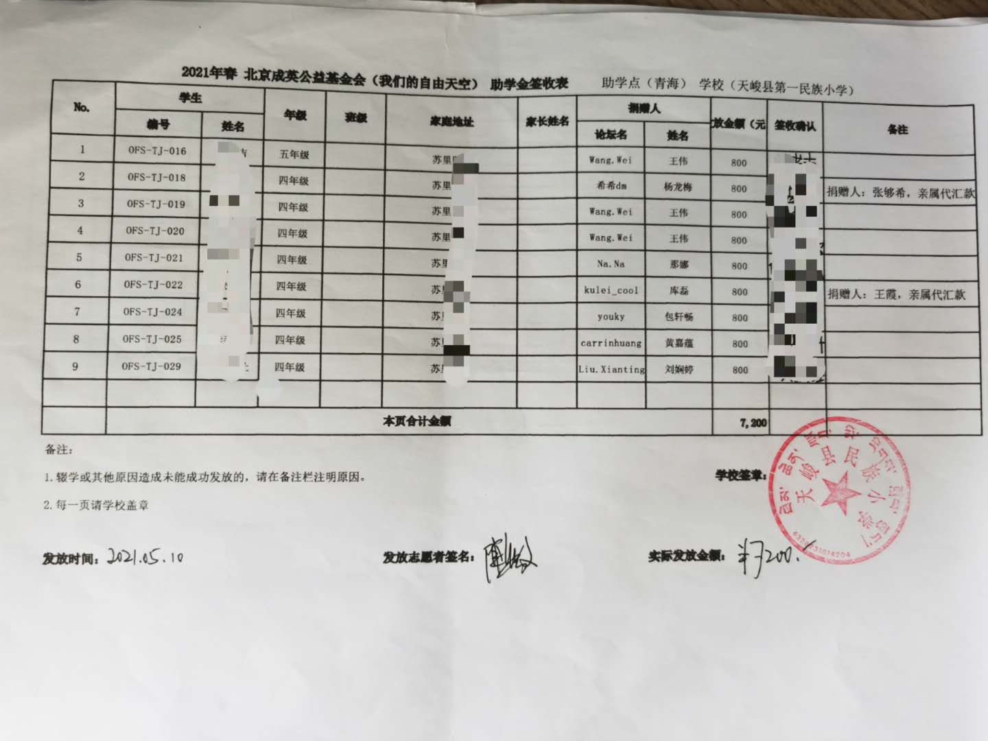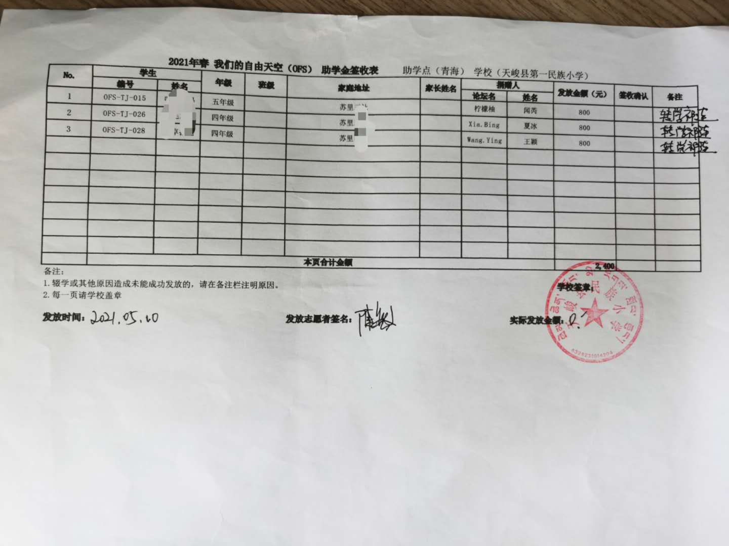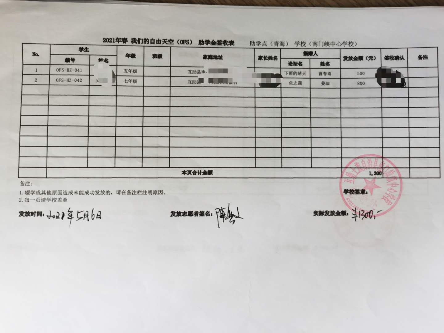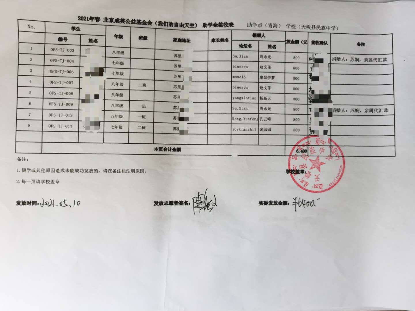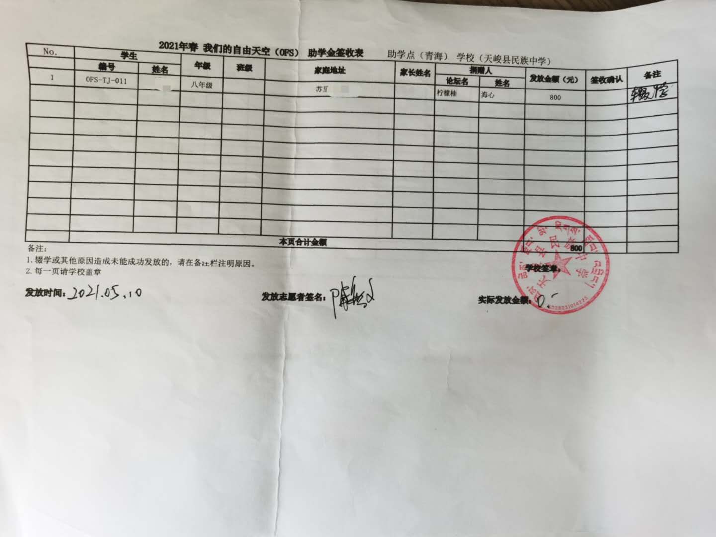 青海省互助县,天峻县2021年春季助学款发放于2021年5月6日-11日,发放完成.(本次由于疫情原因,青海湟源的点暂时取消,以后需要和老师们再进行沟通等事项,目前青海的奖学金项目建立到了互助县。)