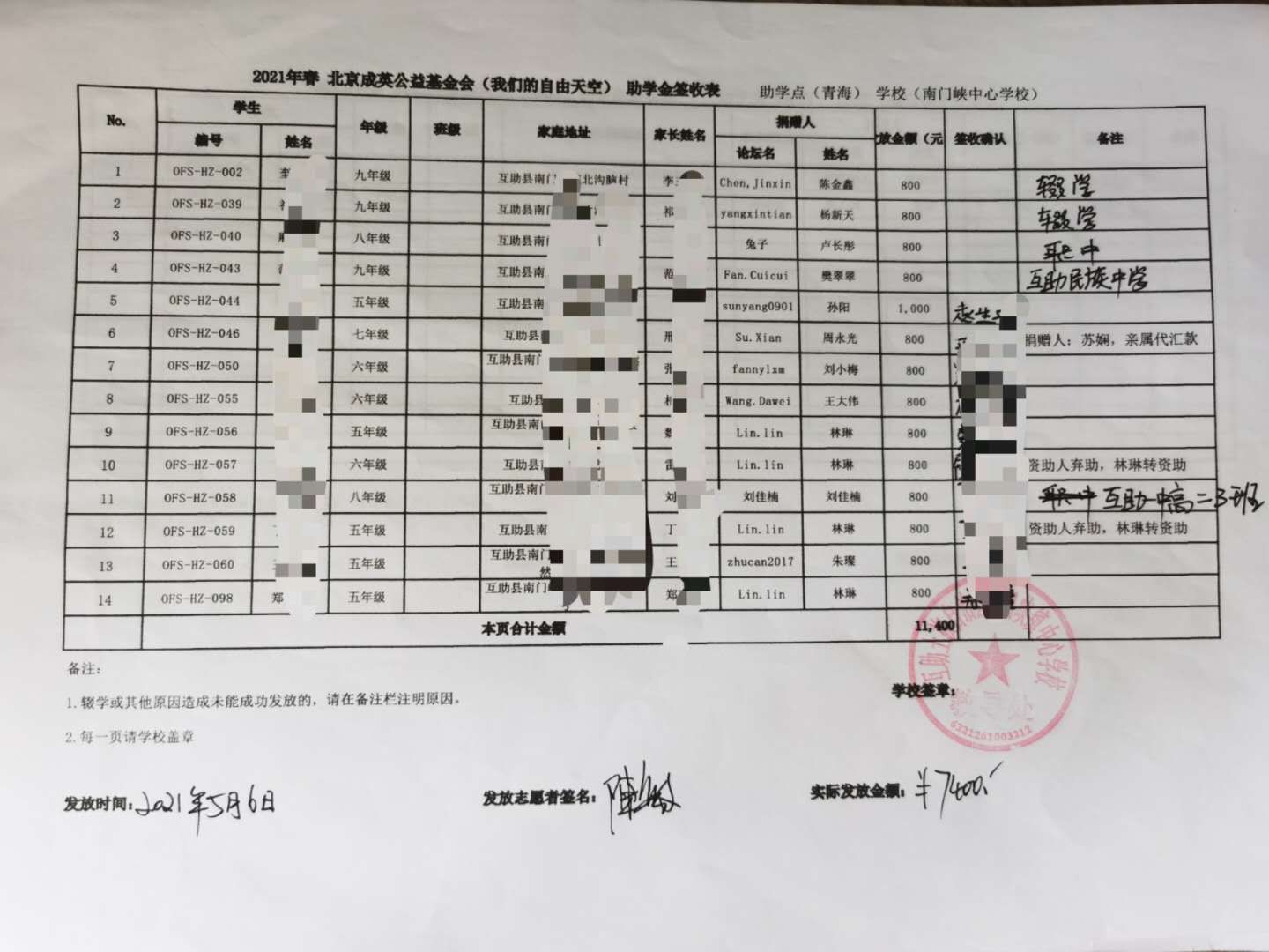 为保护学生隐私,签收表抹去学生姓名,学生资料将近期发送到资助人邮箱,如有疑问,请咨询qinghai@ourfreesky.org,或者kids@ourfreesky.org