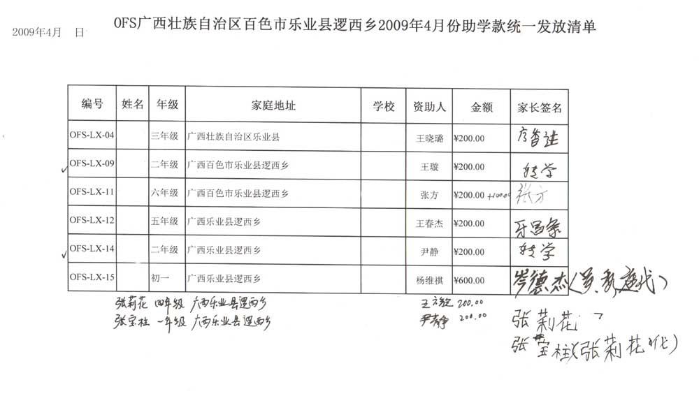 乐业县逻西乡2009年4月份助学款项统一发放清单 [复制链接]