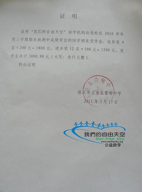 2010年义卖店捐赠物品所得共计6819.53 元。所有资金全部作为玉龙县鲁甸中学的奖学金发放,所附图为学校方面的收据证明。(此次为上半学年的发放证明,下半学年的将在9月份左右走访发放,到时候的收据证明也会在此公布) ,ir(~g+{g