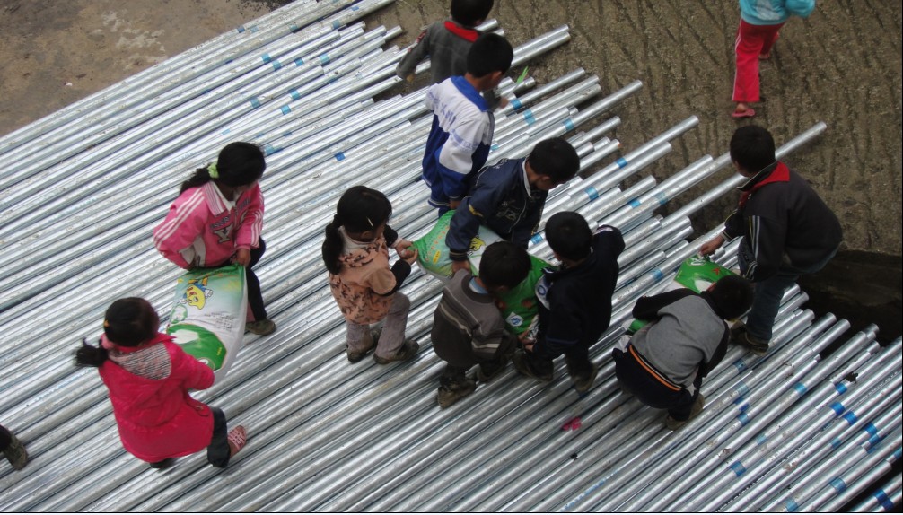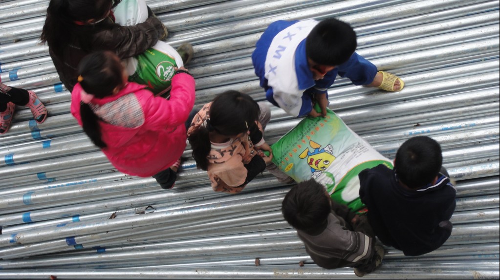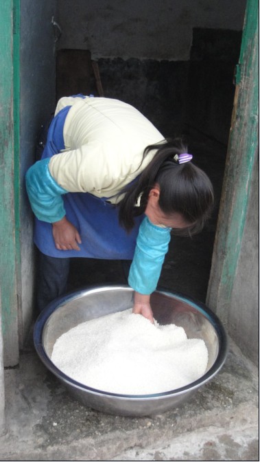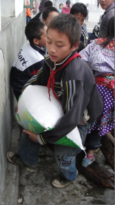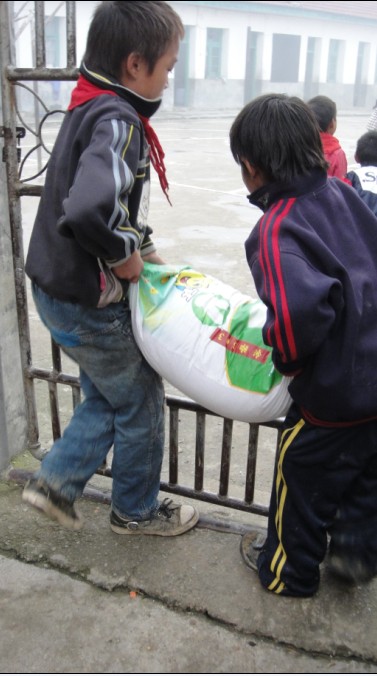 请村委会马副主任把门打开,孩们一窝蜂挤进去抢着抱米袋子,连一年级的小家伙也试图自己抱一袋走……