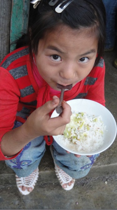 转一圈回来,孩子们已经在吃饭了,都在雨帘下招呼:张老师,吃饭了,我们今天吃好米!