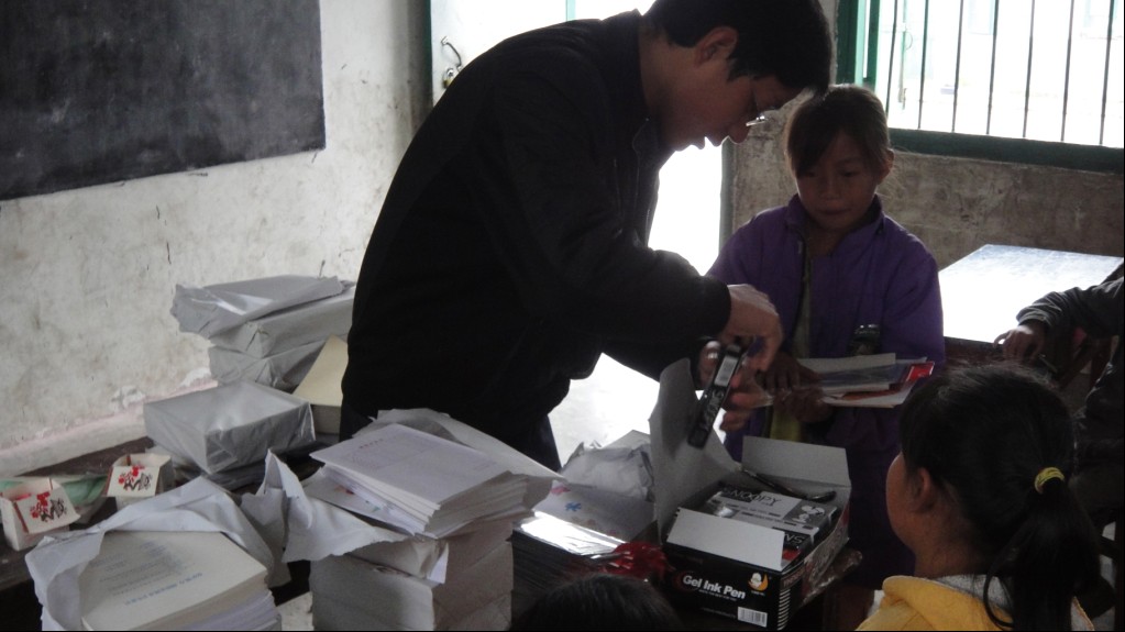学校事务传达完后,各班班主任就领了昨晚分好的文具,带到教室发给孩子们。考虑到孩子们可能会一下子拿到二三十本本子不知道如何保存,就每个学生每一种本子先发2-3本,谁用完了就到班主任那登记取本子,直到他的本子取完为止。发放过程详见后面。