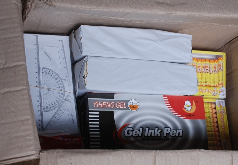 捐赠物品:109位学生,每生作文簿、练习本、中性笔、尺子、橡皮擦以及大米等