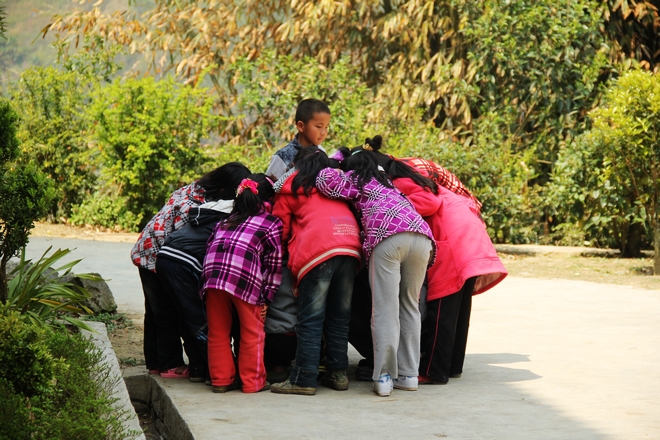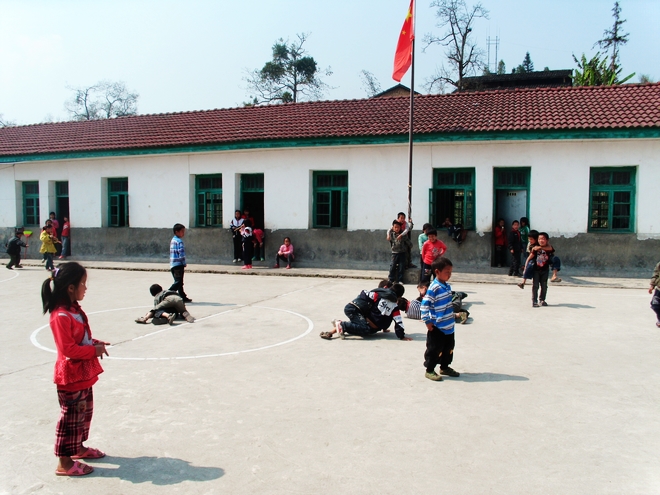 马马小学的孩子们,课间正玩着斗鸡的游戏。