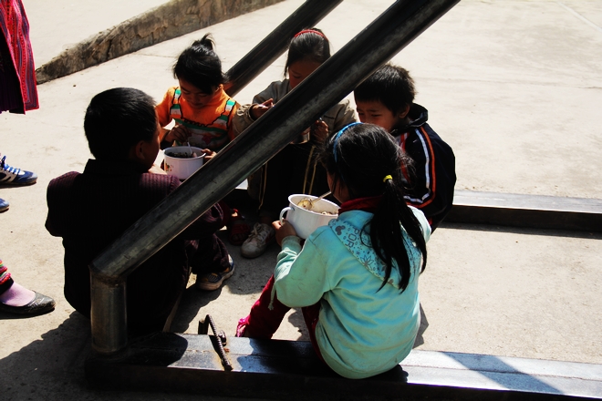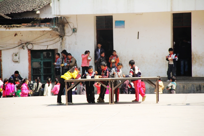 走访出来正碰上孩子们吃午饭。学校里只有食堂没有餐厅,孩子们打了饭就在操场上或站或蹲着吃。