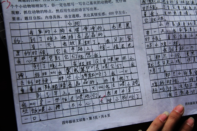 一个四年级孩子的作文。“我家的小狗长得瘦瘦的,毛是黑的,到了晚上眼睛亮晶晶的。”