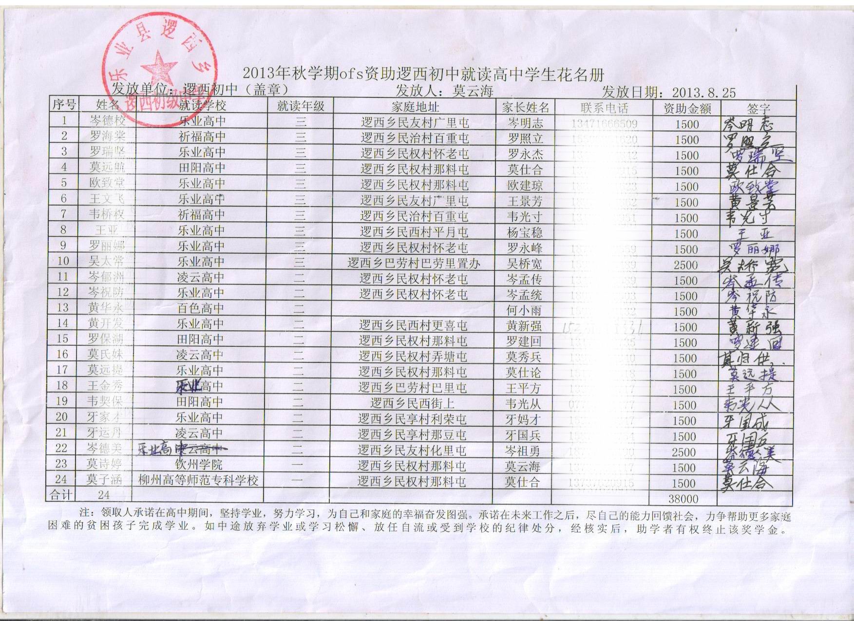 2013秋季乐业逻西初中升学奖学金签收资料公示