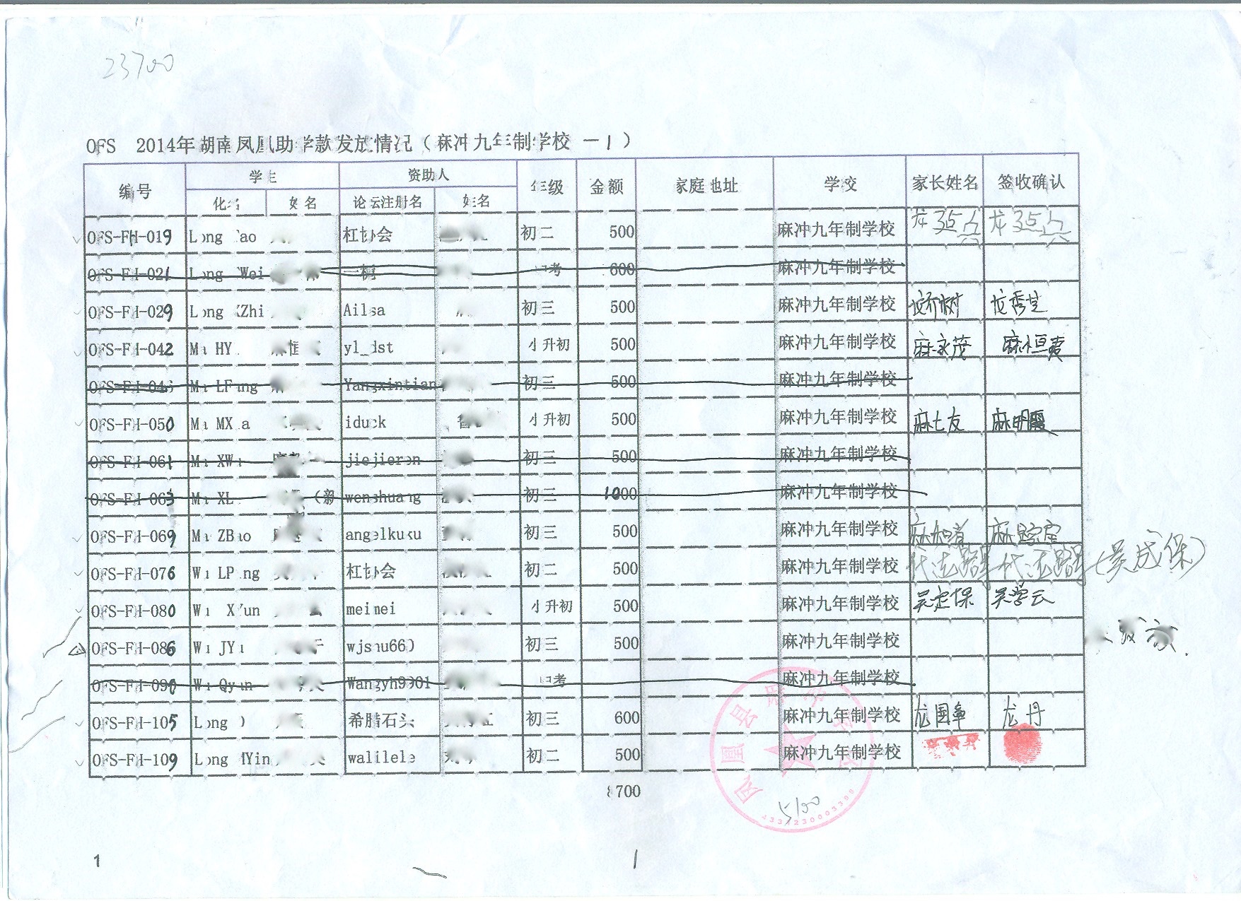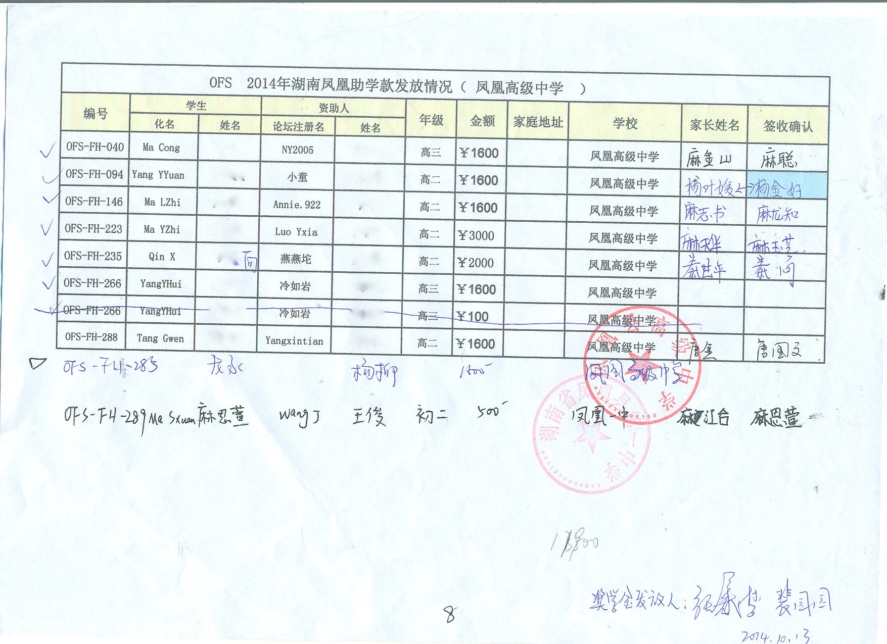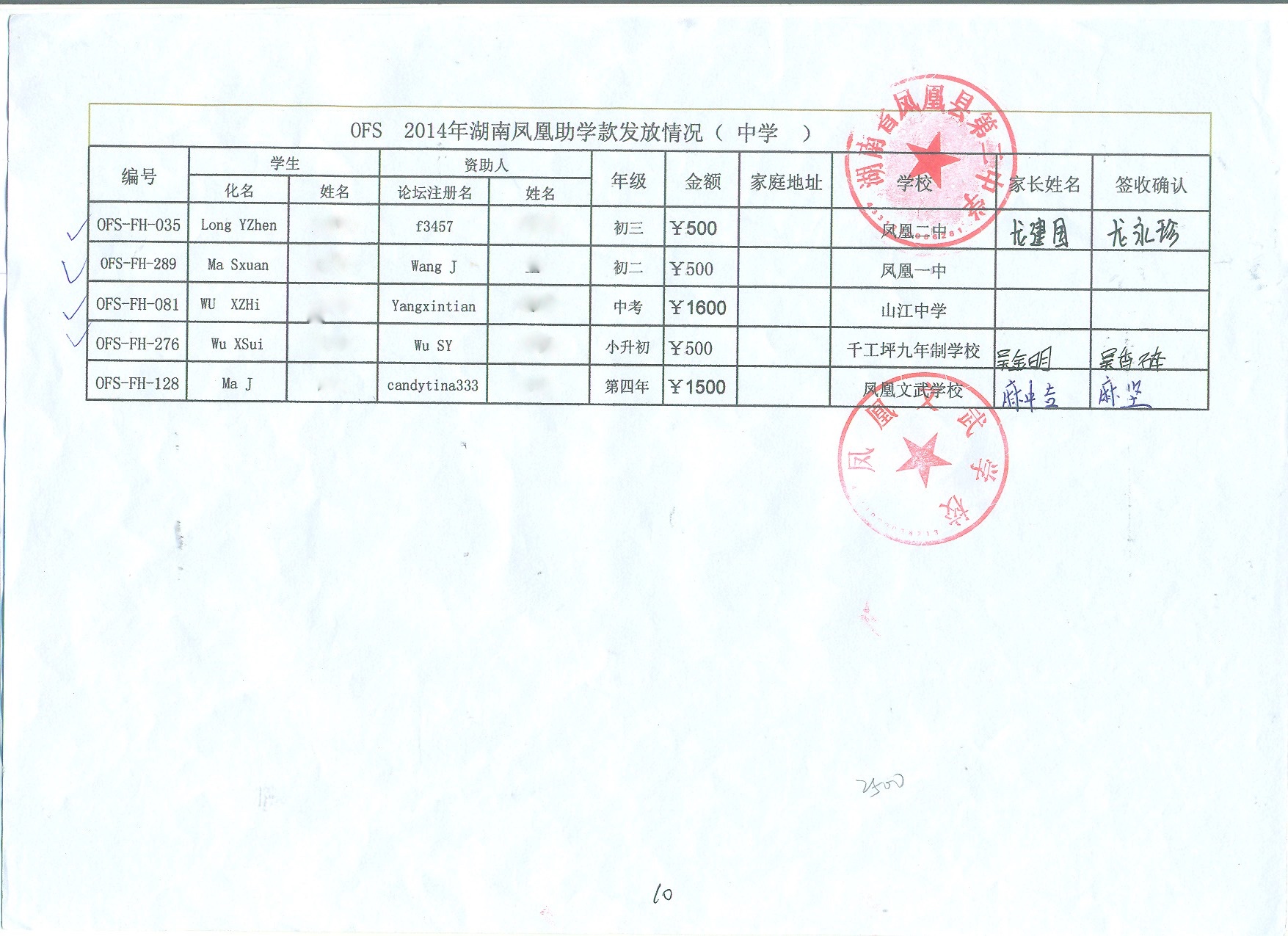 [公 示]2014年10月 OFS湖南省凤凰县助学款发放公示 (已完成) [复制链接]