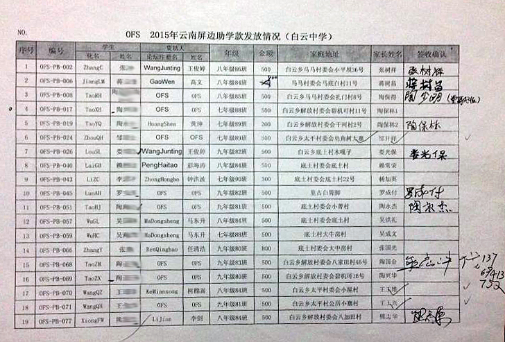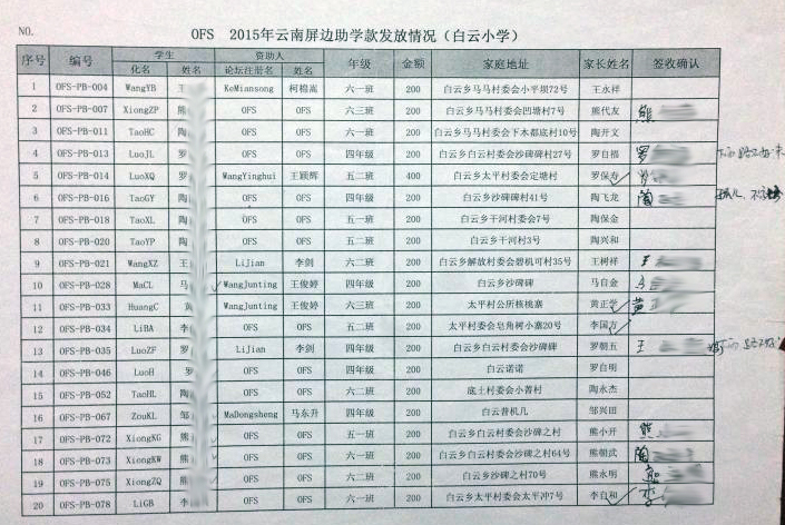 备注:截至发放当日,没有结对或未收到资助人汇款的助学生资助人统一为OFS。