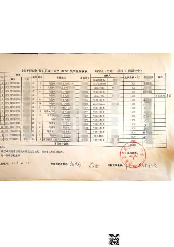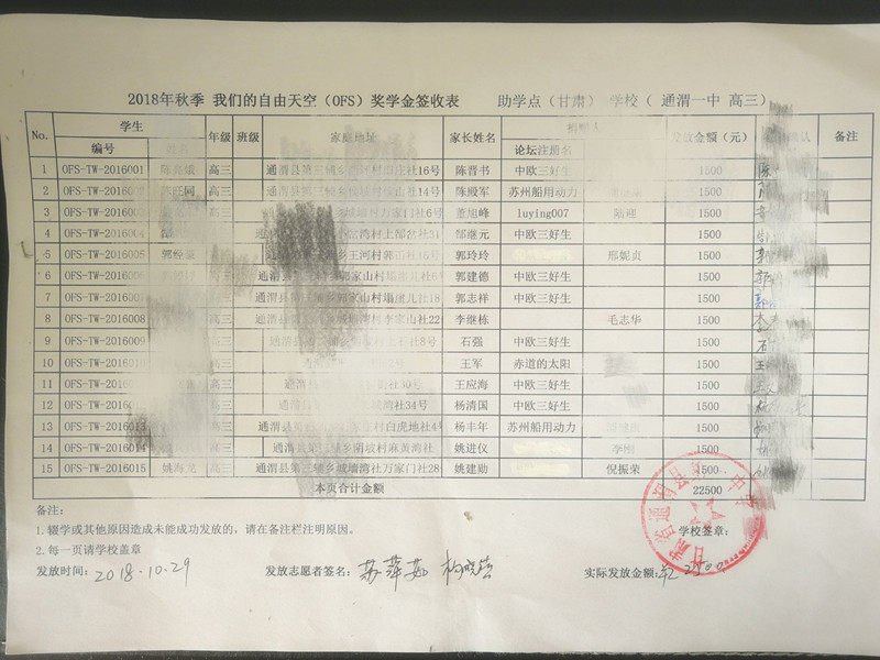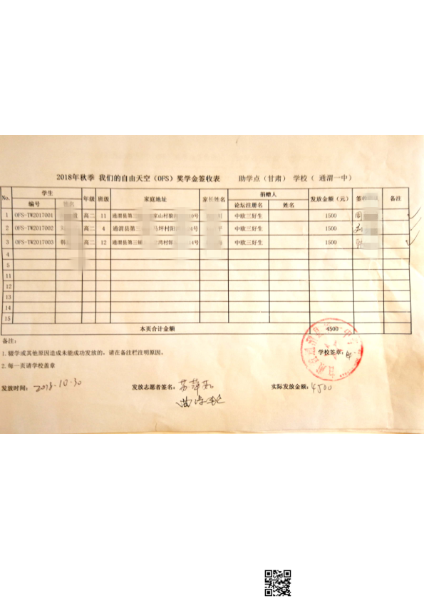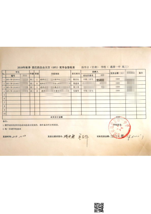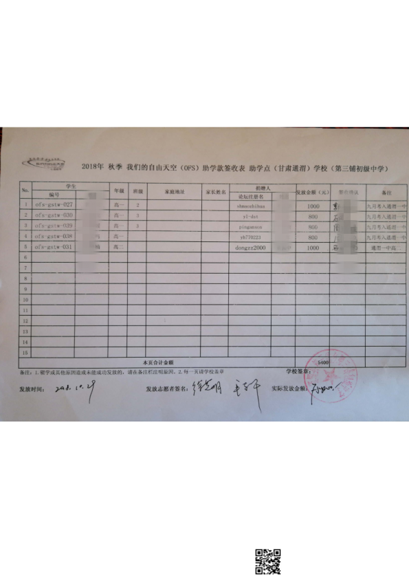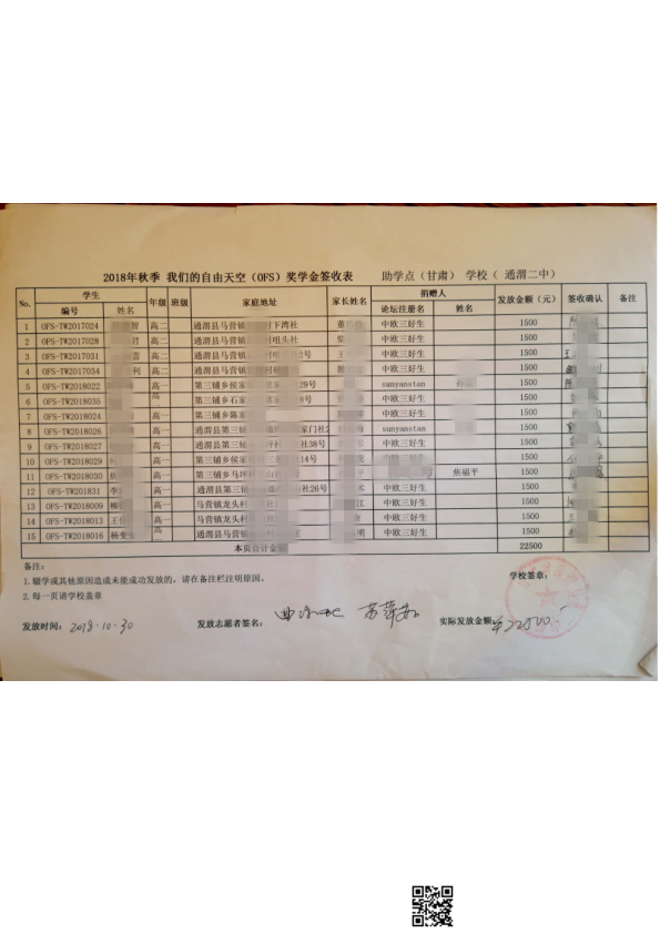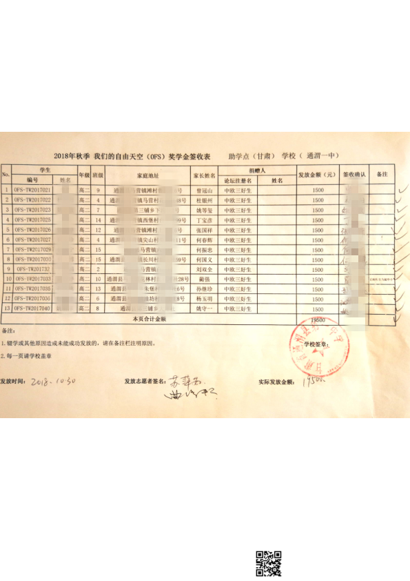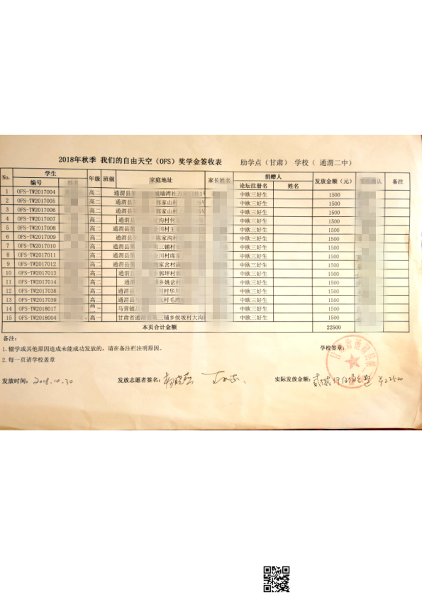 为保护学生隐私,签收表抹去学生姓名,学生资料将近期发送到资助人邮箱,如有疑问,请咨询gansu@ourfreesky.org,或者kids@ourfreesky.org