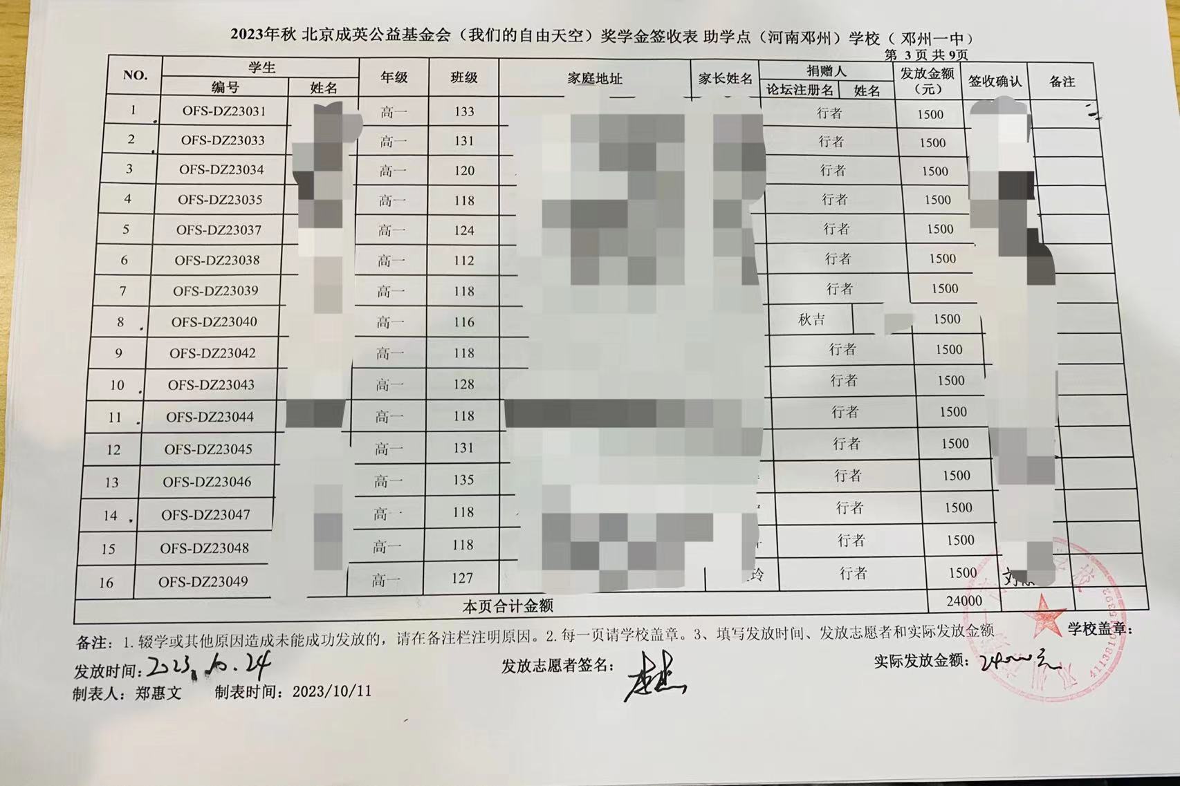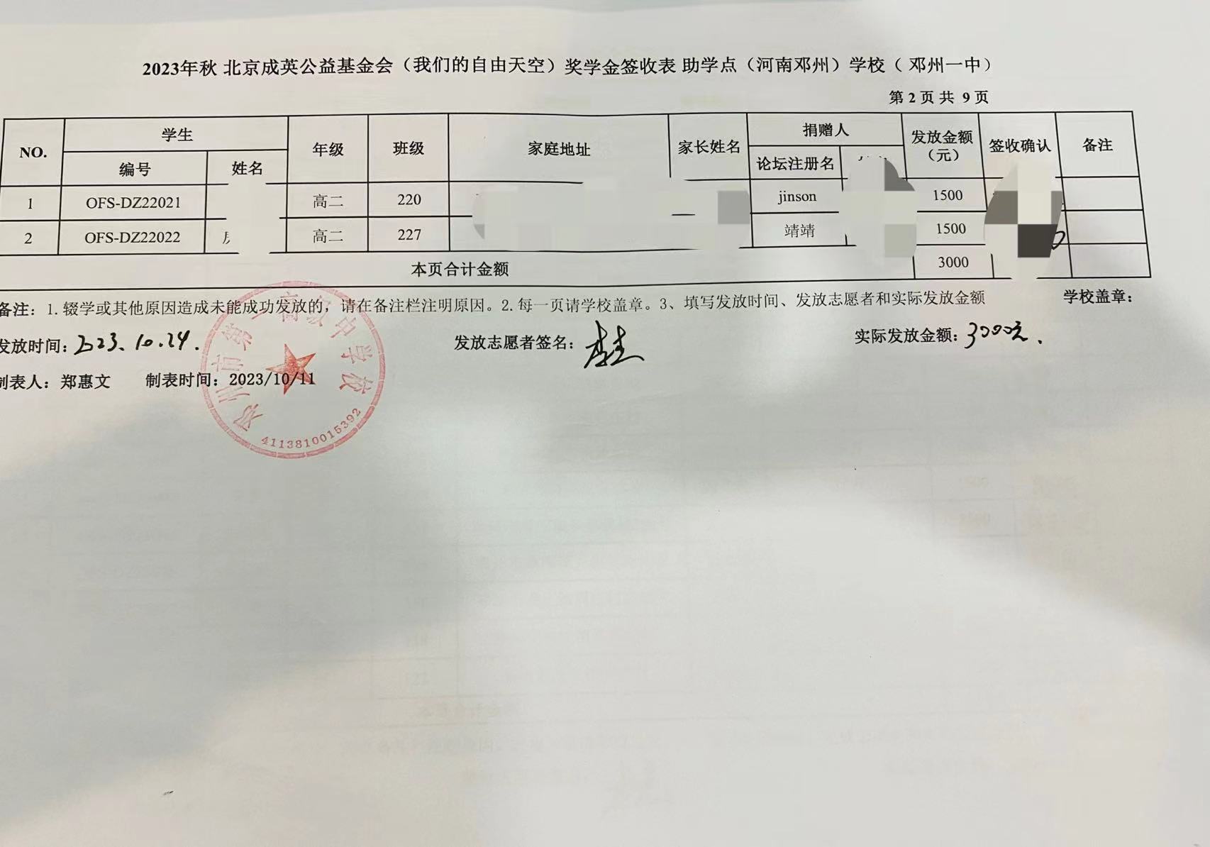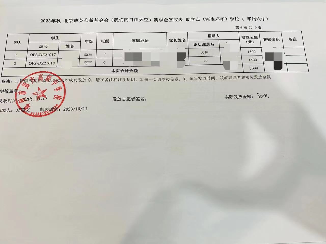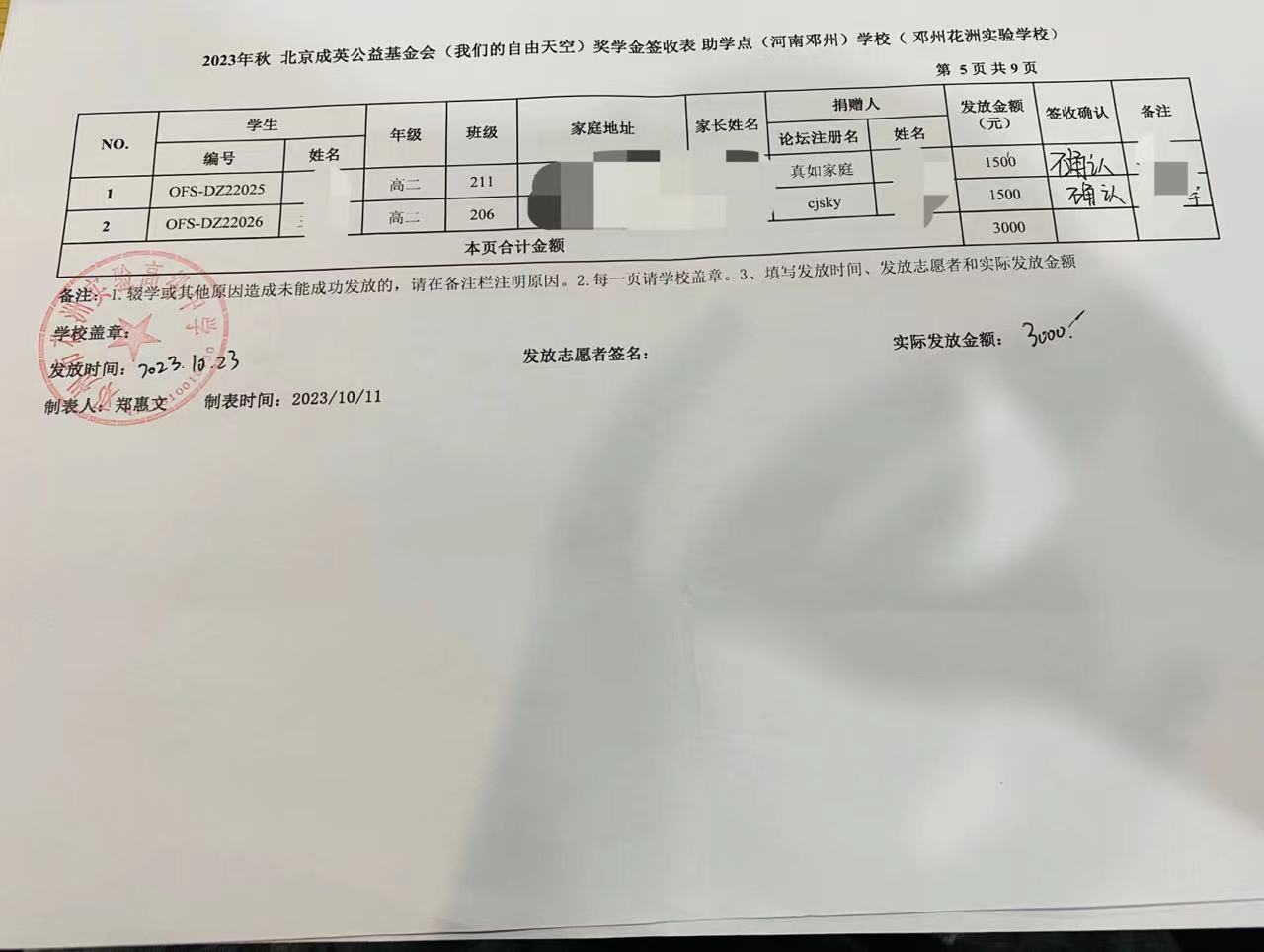 为保护学生隐私,签收表抹去学生姓名,学生资料将近期发送到资助人邮箱,如有疑问,请咨询dengzhou@ourfreesky.org或者kids@ourfreesky.org
