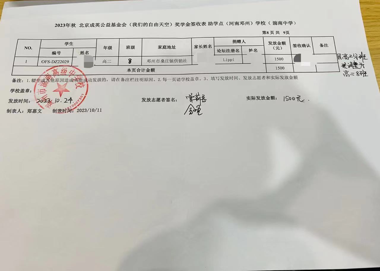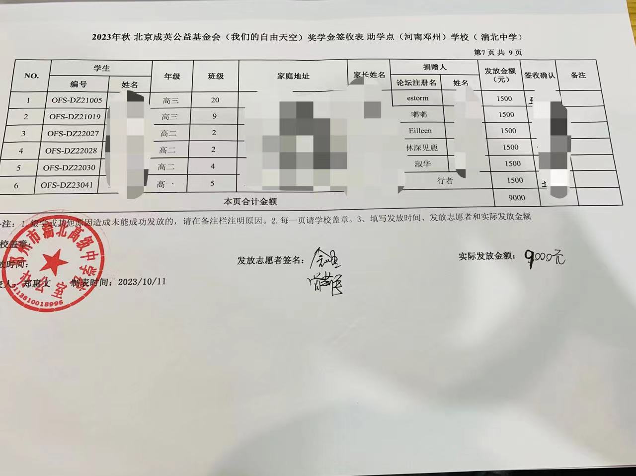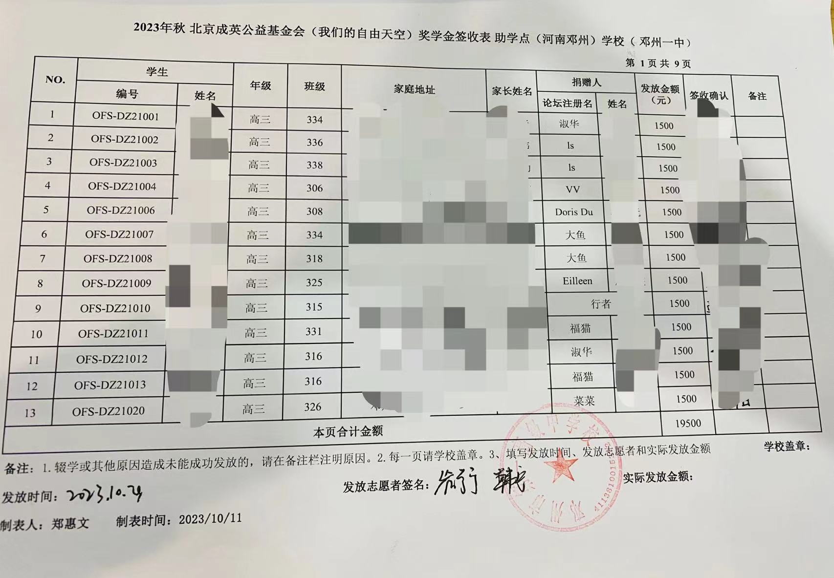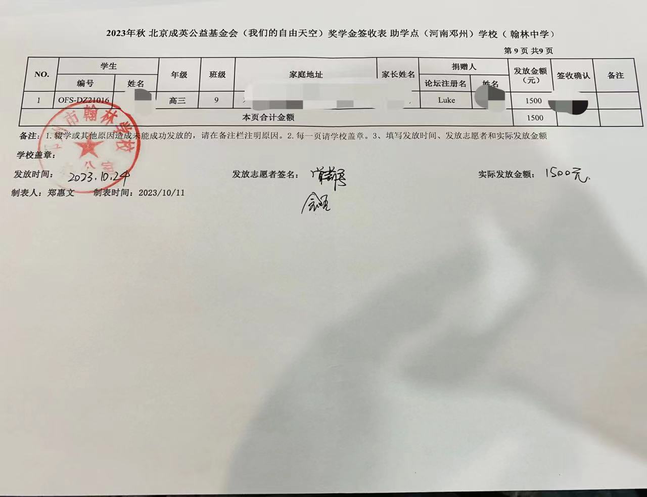为保护学生隐私,签收表抹去学生姓名,学生资料将近期发送到资助人邮箱,如有疑问,请咨询dengzhou@ourfreesky.org或者kids@ourfreesky.org