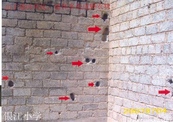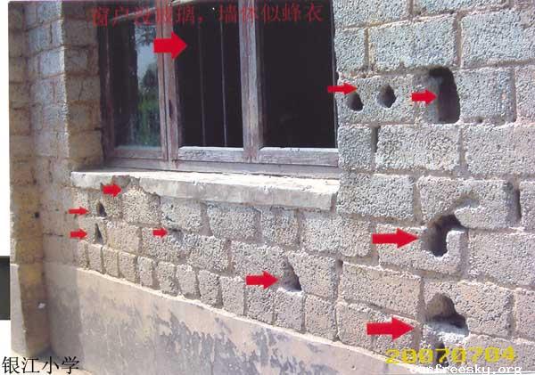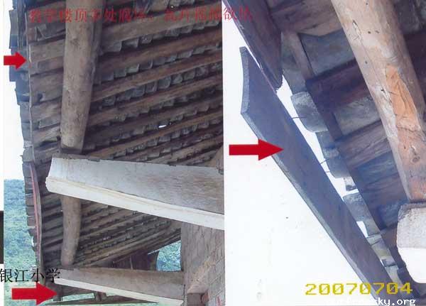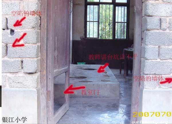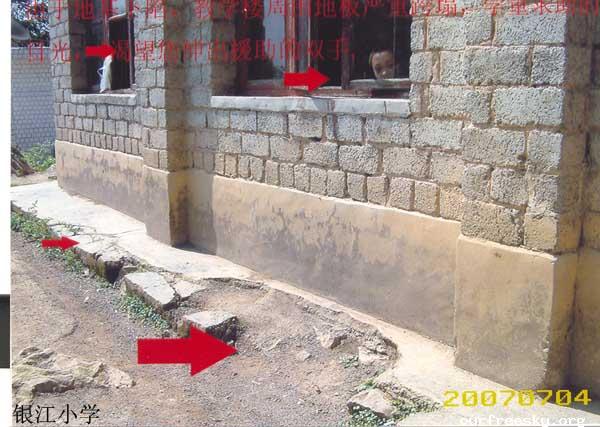 银江小学地处偏远,若下大雨,只能步行。若是晴天,坐摩托车从新民镇出发大约需45分钟。教学楼是一座两层的砖木结构房,砖是当地特有的一种用水泥和沙混合制成的空心砖。空心砖砌成的外墙已裂,屋顶所铺的青瓦部分地方已松动,由屋顶下的木头椽子勉强支撑,已被县教育局定为危房,但是因为教育局的资金不足,一直没有给小学提供修建资金。小学的周校长粗略计算了一下,若要将屋顶和墙面翻修,大约需要4000元左右