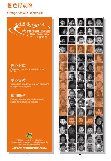 背面看起来稍微有些乱,可尝试如下处理:(1)用孩子照片组成“OFS”字母,其他地方空出来分别用橙蓝绿底色或加点其他简单设计;(2)或有字母的地方不用孩子照片