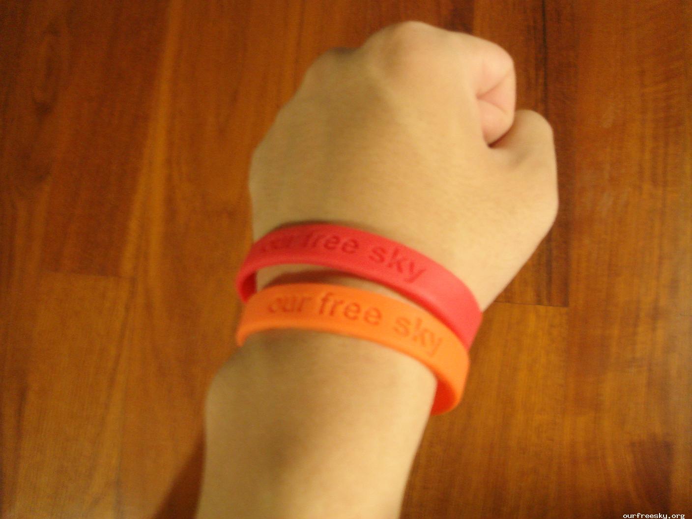 在本人(即Terence,blue老师的学生)的努力下,南通一家硅胶产品生产厂家为OFS免费生产了300只硅胶腕带,上面刻有our free sky字样,这些腕带将由本人交给blue老师,一部分进行义卖,一部分免费赠送给OFS志愿者。下面是一些图,不是很清楚,大家凑和着看一下。 #RAez:BI