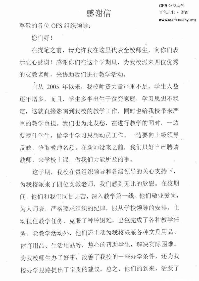 感谢OFS-S-2008017 Kim,OFS-S-2008018 天海一线,OFS-S-2008021 齐储伊格,OFS-S-2008022 Landon,OFS-S-2008027 玉兔玲珑,OFS-S-2008030 缄嘉,OFS-S-2008031 enus等7位志愿者在广西壮族自治区百色市乐业县逻西乡于2008年春季进行了一个学期的爱心支教活动。