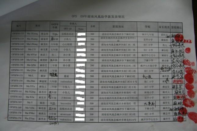 ·        OFS湖南凤凰‘结对子’受助学生之助学金的发放(仅包括截止到当日所有对公汇款已到账之款项,不含通过其他途径之汇款)
