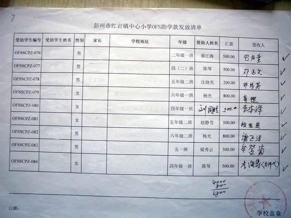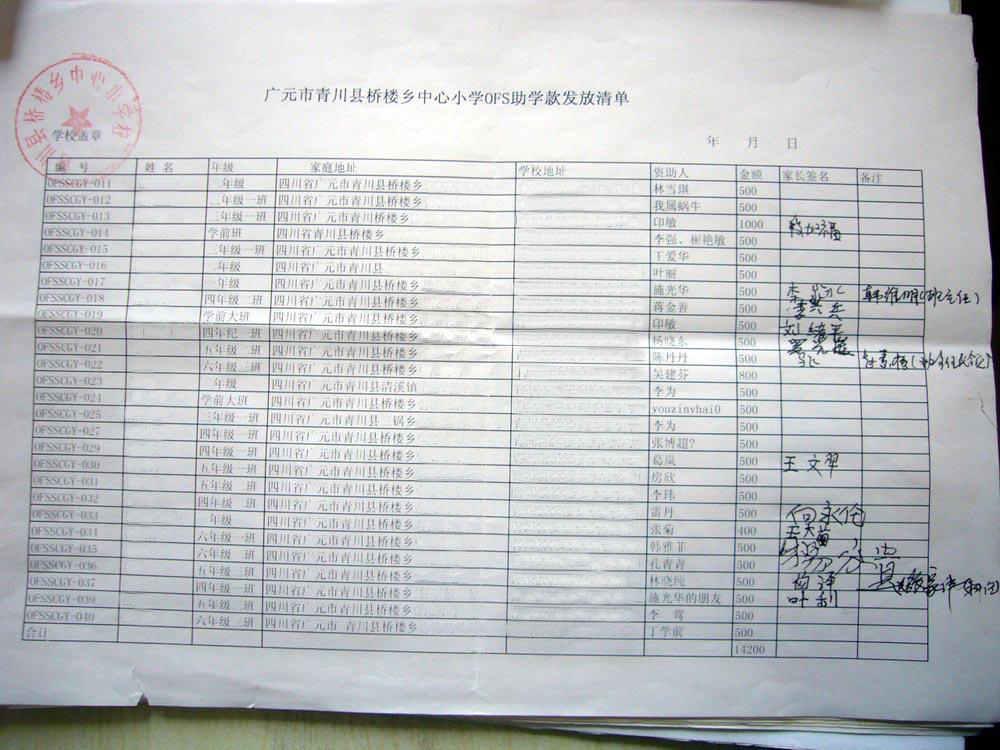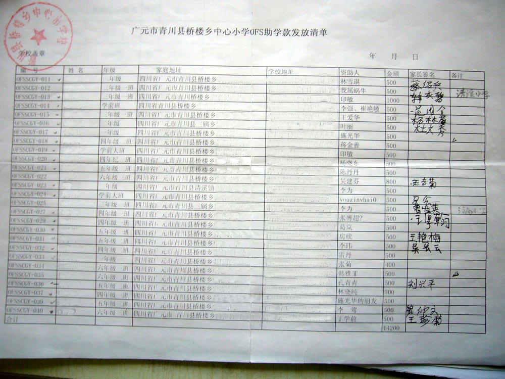 2010年五月中下旬,经OFS公开面向社会招募,楚天和脆脆、飘飘、白桦林、琦琦五位志愿者赴四川之青川、彭州两地助学点回访(第四批次),在当地学校见证下发放2010年度资助人委托转交的资助款。现公示如下: ~F'6k&A^q