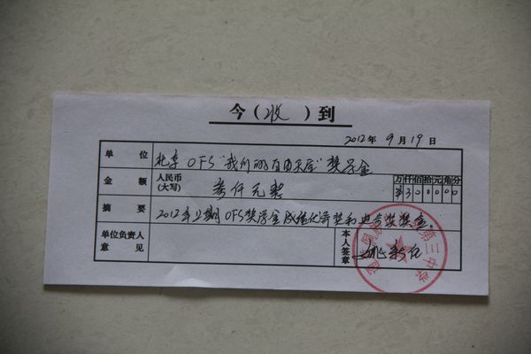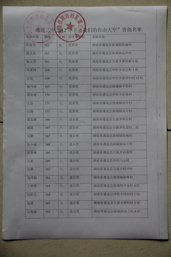 2012年9月,“我们的自由天空”对通道侗族自治县第三中学发放奖学金叁仟元整。