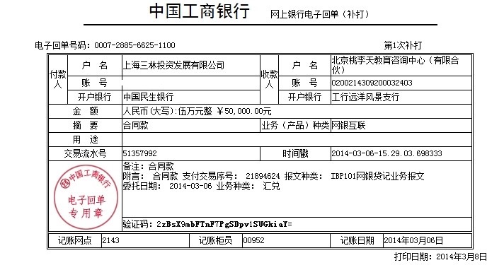 收到上海三林投资发展有限公司赠款伍万元整 ¥50,000.00元。 rYq8OZLi