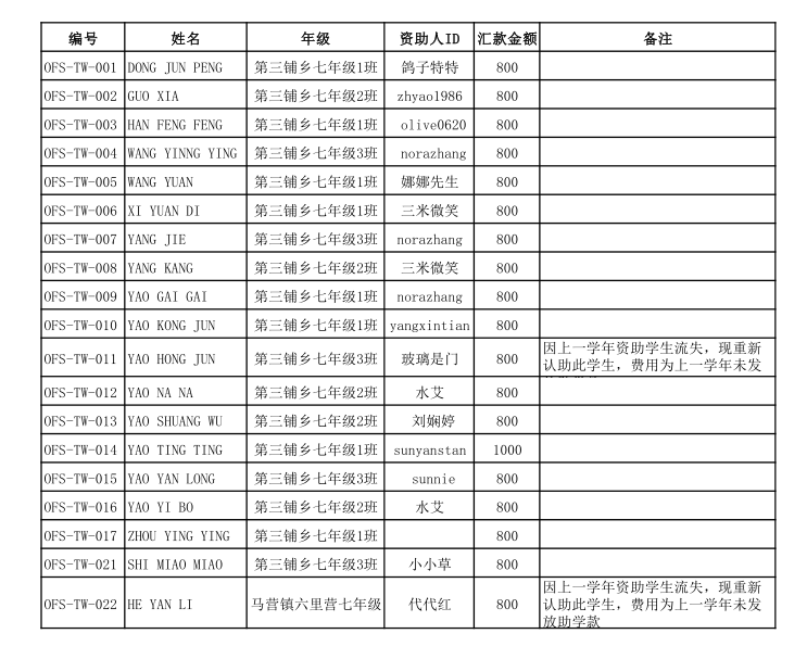 以下是2015年甘肃通渭助学确认收到的汇款,共19位受助学生(编号001-022,其中018、019、020三位因未至受助学生家中走访暂未公示结对),部分资助人汇款中为便于确认带了尾数的及在汇款到发放期间产生的利息将用于购买信封和邮票给受助学生作通信用途。