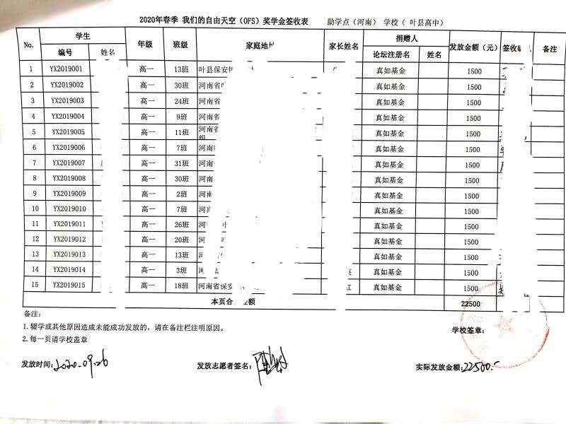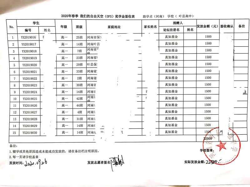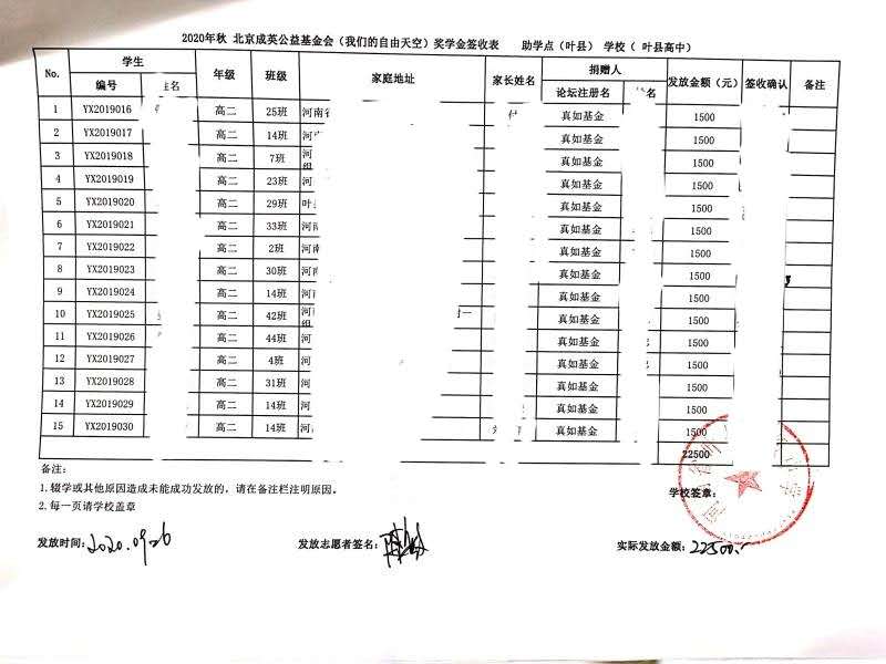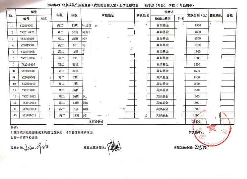 河南叶县2020年秋季奖助学金发放于9月26日-28日顺利发放完成。
