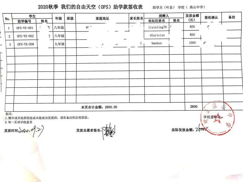为保护学生隐私,签收表抹去学生姓名,学生资料将近期发送到资助人邮箱,如有疑问,请咨询yexian@ourfreesky.org或者kids@ourfreesky.org