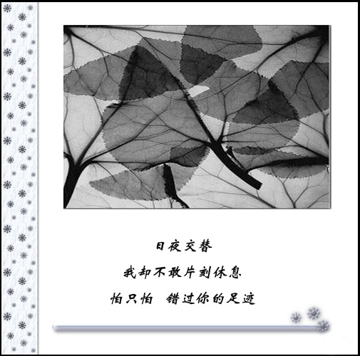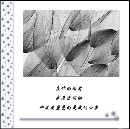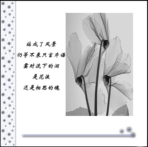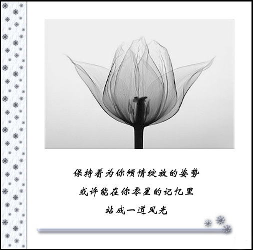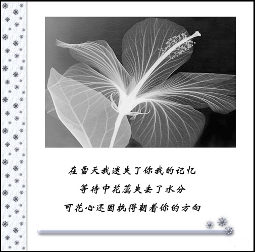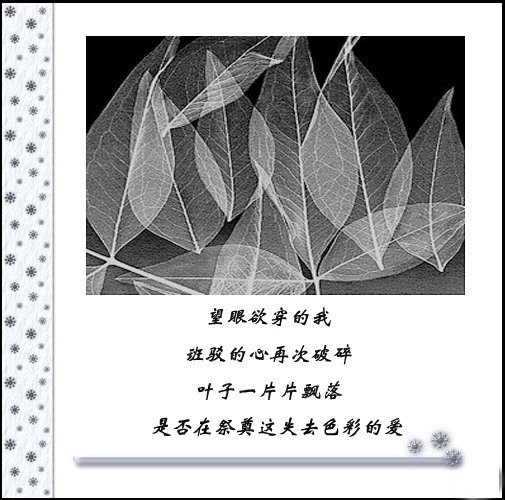爱情 让人不可琢磨 当颜色鲜艳时是多么美丽可爱!~ 当没有色彩时多么伤感!~ 世间没有绝对永恒,花开花谢,即使在好的颜料也会有掉色的一刻,只有抓住色彩鲜艳的时候才能懂得珍惜,才能才失去颜色懂得回味,才能在下次花开之时懂得把握,懂得保持.