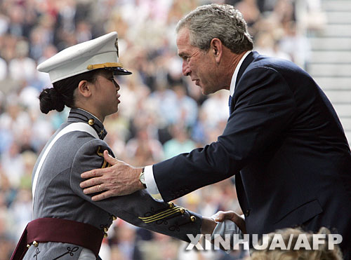 5月27日,在美国纽约的西点军校举行的毕业典礼上,美国总统布什向一名学员祝贺。美国著名的西点军校当天举行毕业典礼,布什参加了庆祝活动。 新华社/法新