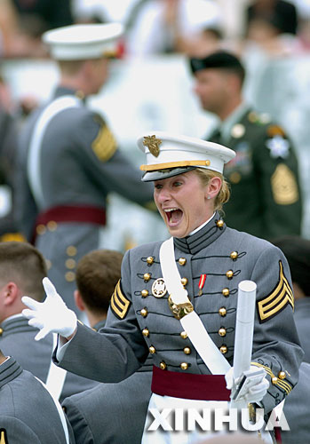5月27日,在位于美国纽约的西点军校,一名女毕业生拿到毕业证书后兴奋不已。当天,美国西点军校举行了2006年度毕业典礼,共有861名毕业生获得了毕业证,其中包括65名亚太裔学生。美国总统布什参加了当天举行的西点军校毕业典礼并为毕业生颁发毕业证书。 新华社记者 赵鹏 摄