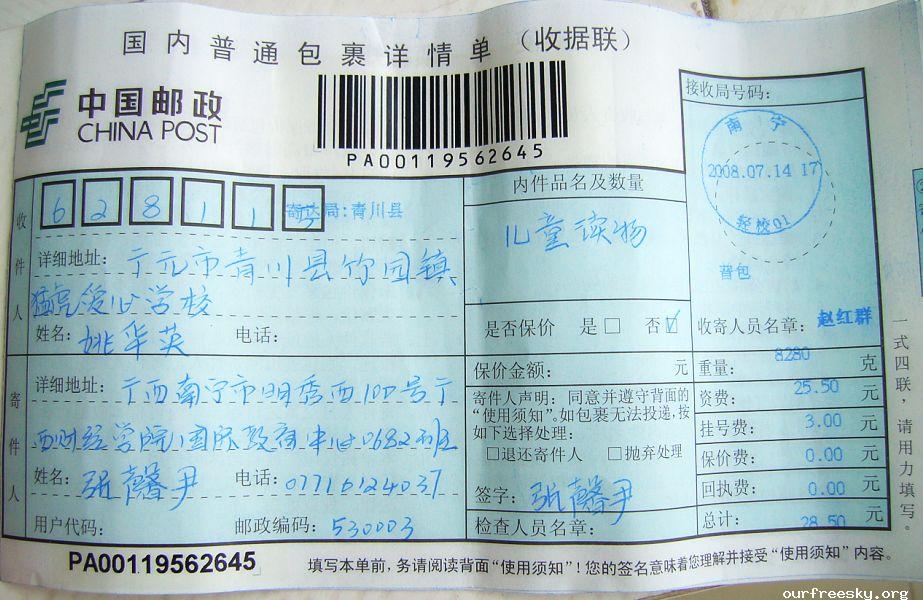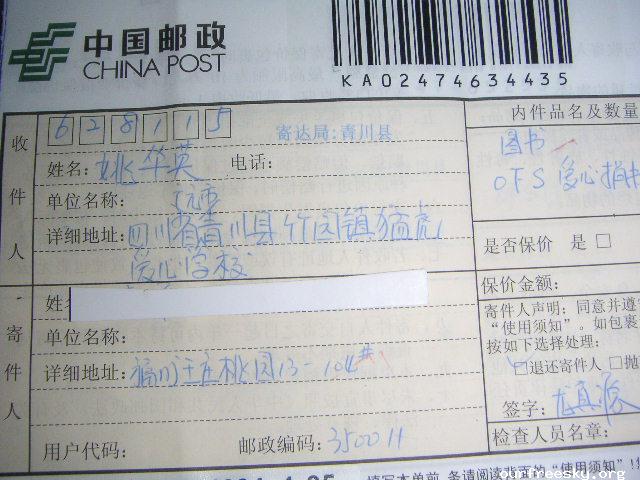 两箱书合起共97本,本想把书目打印出一起寄过去的,但不幸U盘中毒没能给他们附上具体数目……希望猛虎小学能顺利接收到这批书籍。 oswS<t{Z